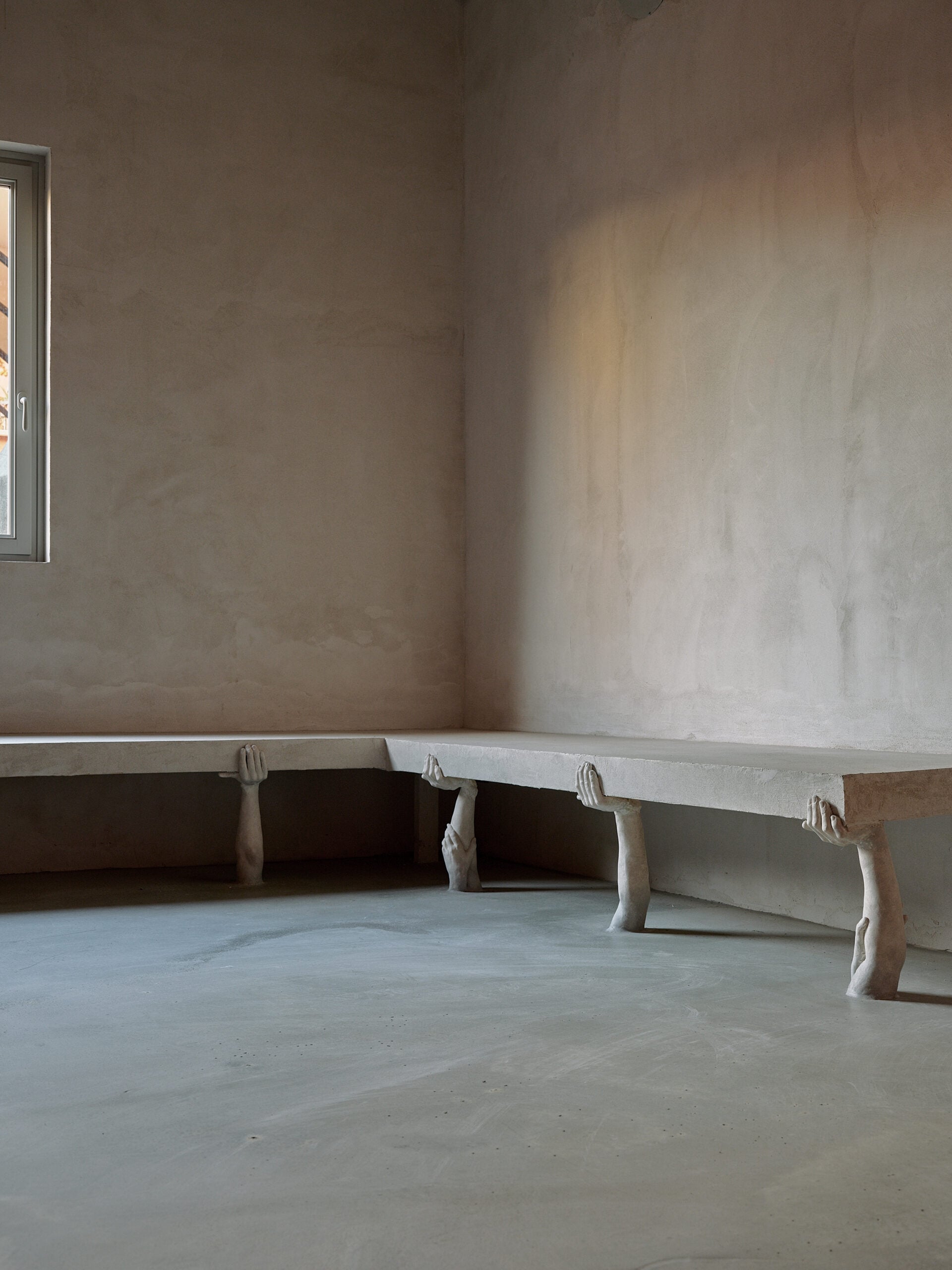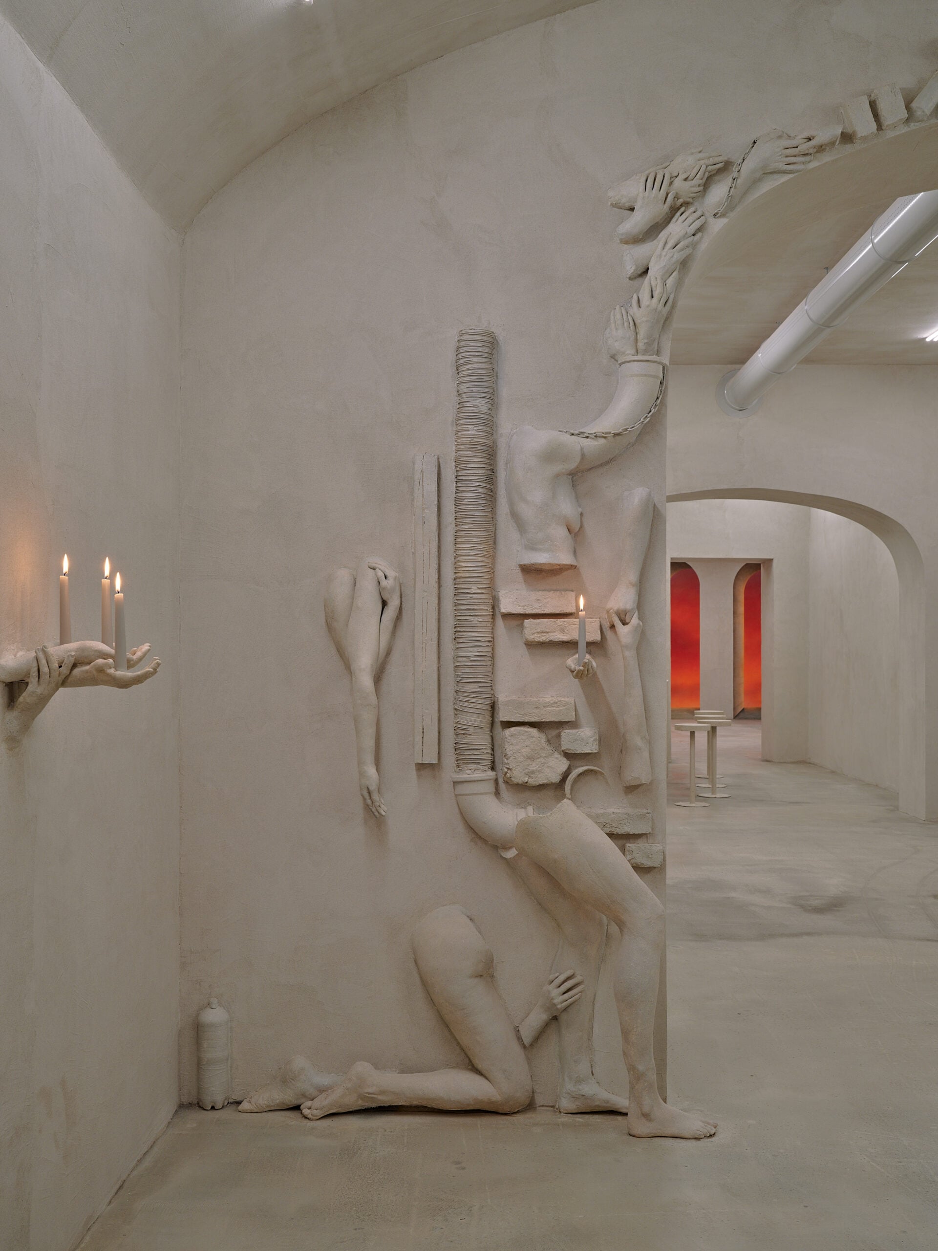 Sebbene distanti per pratiche artistiche, Keith-Roach e Page hanno trovato un punto comune nell’illusione. Entrambi utilizzano la pittura trompe l’oeil perché ne riconoscono qualità sovversive: attraverso gli effetti dipinti, non siamo solo ingannati, ma invitati a osservare più da vicino e a testimoniare il fallimento dell’illusione. I rilievi di Keith-Roach sembrano estensioni lapidee dello spazio, ma a uno sguardo attento rivelano la loro natura in gesso dipinto, mentre il wall painting prospettico di Page sembra infinito da alcuni angoli, ma si deforma e si distorce mentre ci muoviamo nello spazio.