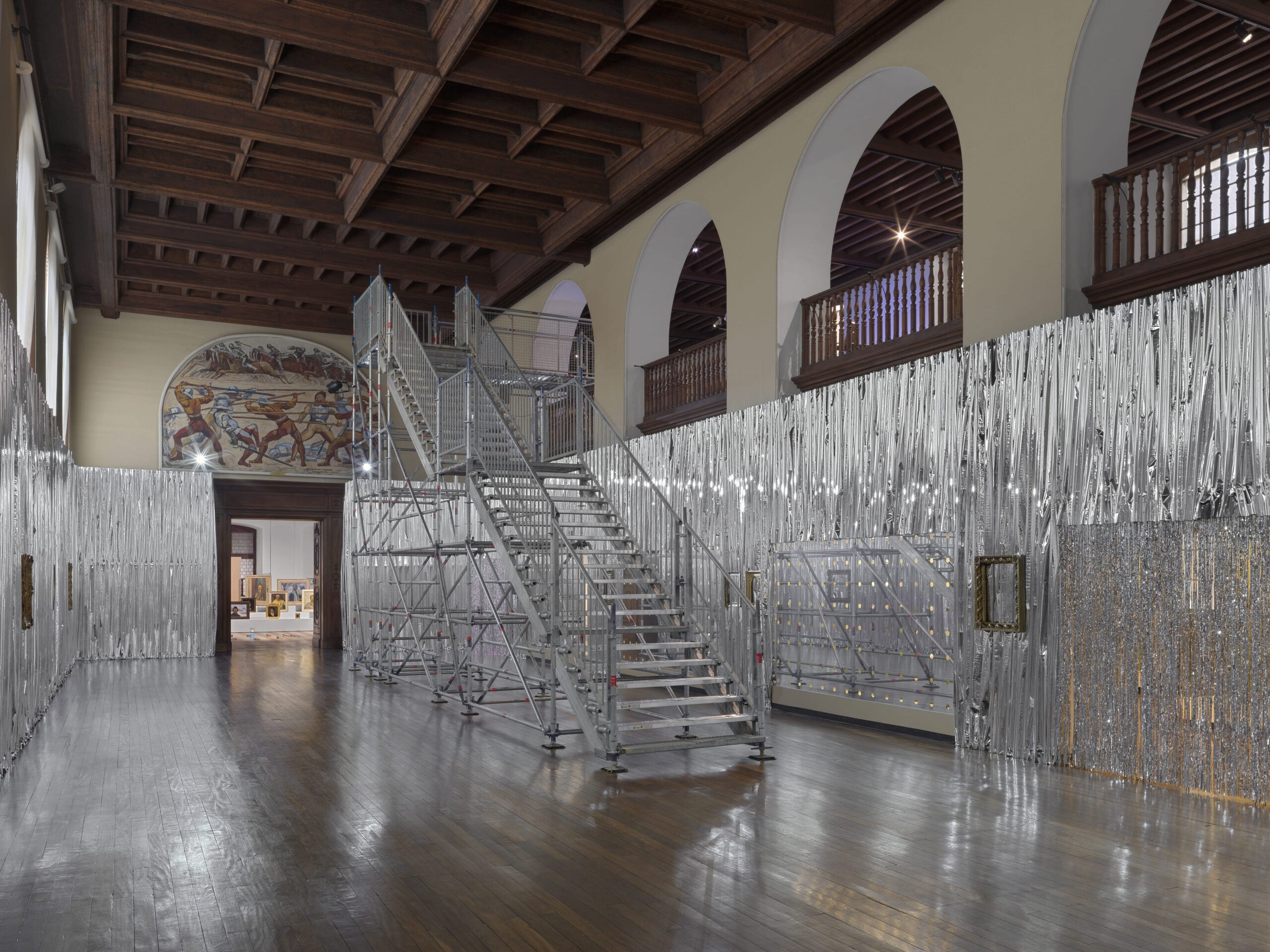 Pacifista convinto (nel 1967 si fece quattro mesi di carcere per non aver preso parte al servizio militare), Armleder ha ricoperto le pareti del salone dell’armeria con della sbrilluccicante, leggerissima carta argentata che silenzia il carattere spiccatamente militare dello spazio, ma non lascia indifferenti per l’assurdità dell’allestimento. Il tutto, infatti, è completato da una serie di cornici vuote prese dalla collezione museale e appese su quella stessa carta argentata. La non-armeria spinge, così, a chiedersi cosa stia venendo nascosto, quale sia il rimosso, in un’operazione eticamente definita e artisticamente ben costruita, che non si abbandona a ovvietà ideologico-politiche che spesso poco hanno a che fare con l’Arte. Anzi, per i materiali e i colori impiegati, che richiamano la palla argentata dell’ingresso, spinge al limite quel senso di gioia e svago che domina tutta la mostra, generando un cortocircuito tra spazio, allestimento e messaggio sotteso.