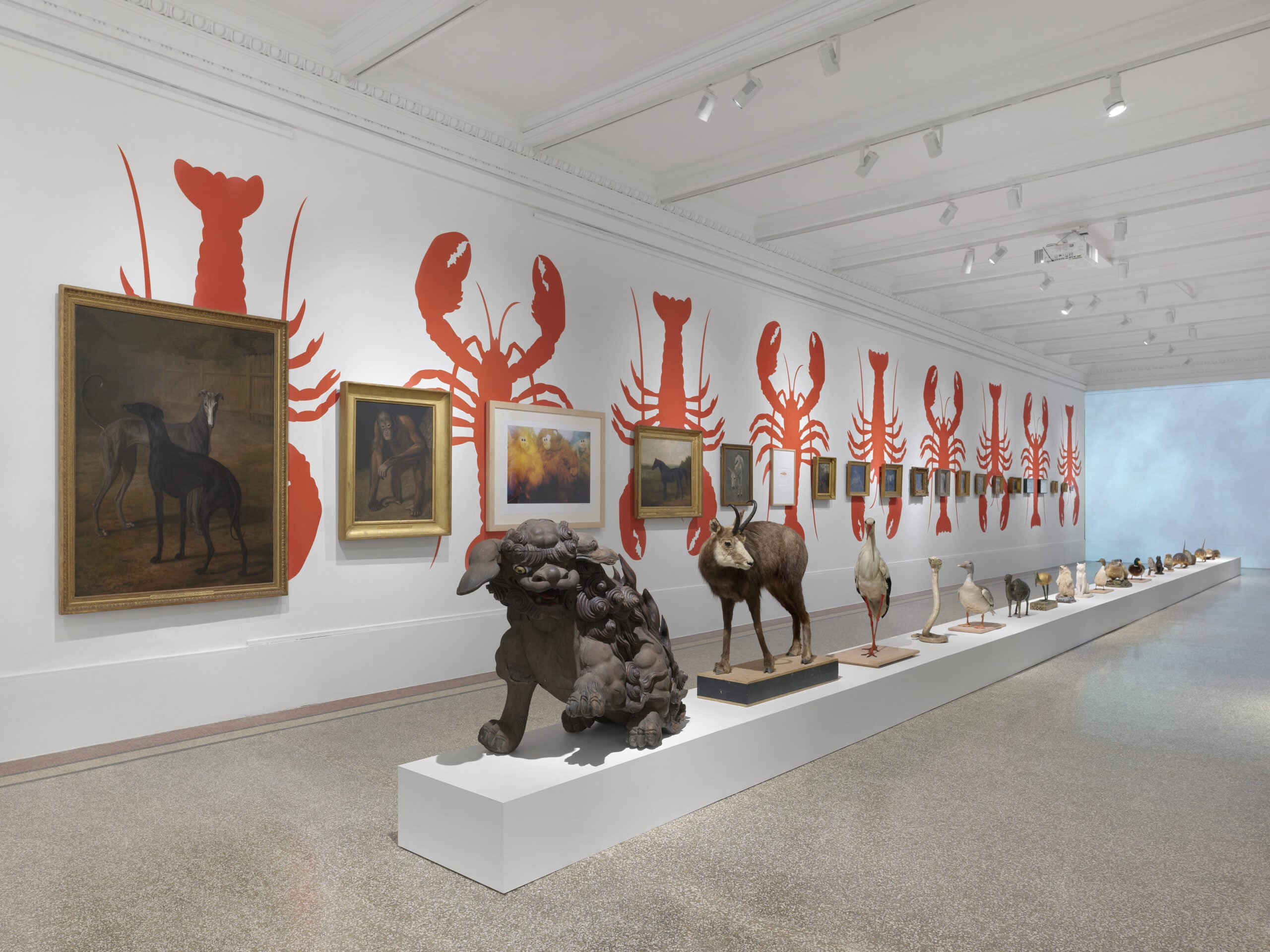 Ormai quasi ottantenne, John M Armleder ha attraversato innumerevoli stagioni e diversi panorami dell’arte internazionale dei Secoli XX e XXI. Rinnovandosi e cambiando, chiedendosi costantemente quali siano il significato e il ruolo dell’arte, Armleder è stato – ed è – capace di mantenere una riconoscibilità e un’identità che gli derivano proprio dalla costante messa in discussione di sé e del mondo; dall’accettazione di molteplici possibilità; dal riconoscimento di una pluralità di risposte credibili. E anche la mostra di Ginevra restituisce questa pluralità. Una solennissima stanza in cui i vetri di teche e reliquiari – circondati dalle vetrate della cattedrale cittadina risalenti al XV secolo – creano un puzzle di riflessi e di vuoti cede il passo a una divertente carrellata di animali impagliati, mummificati e scolpiti che si guardano attorno per capire dove siano finiti. Risposta: sono finiti tra i polpi azzurri e le aragoste arancioni di Armleder dipinti sui muri. La collezione diventa, così, un gioco di incastri e rimandi tematici, dove tutto coesiste cronologicamente: dalle effigi di gatti dell’antico Egitto fino al cagnetto dipinto da Alex Katz.
