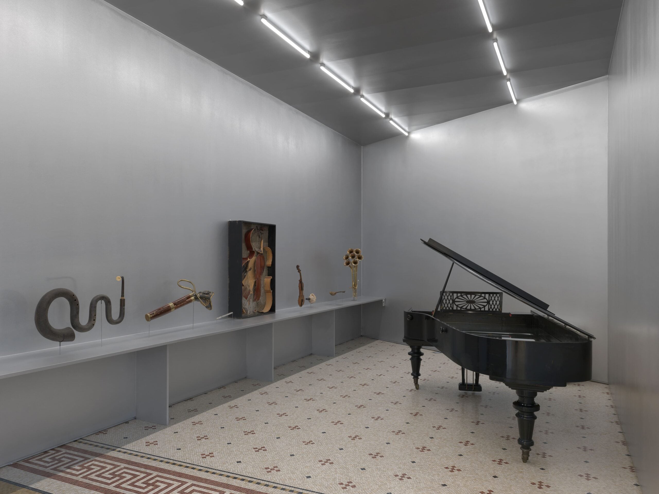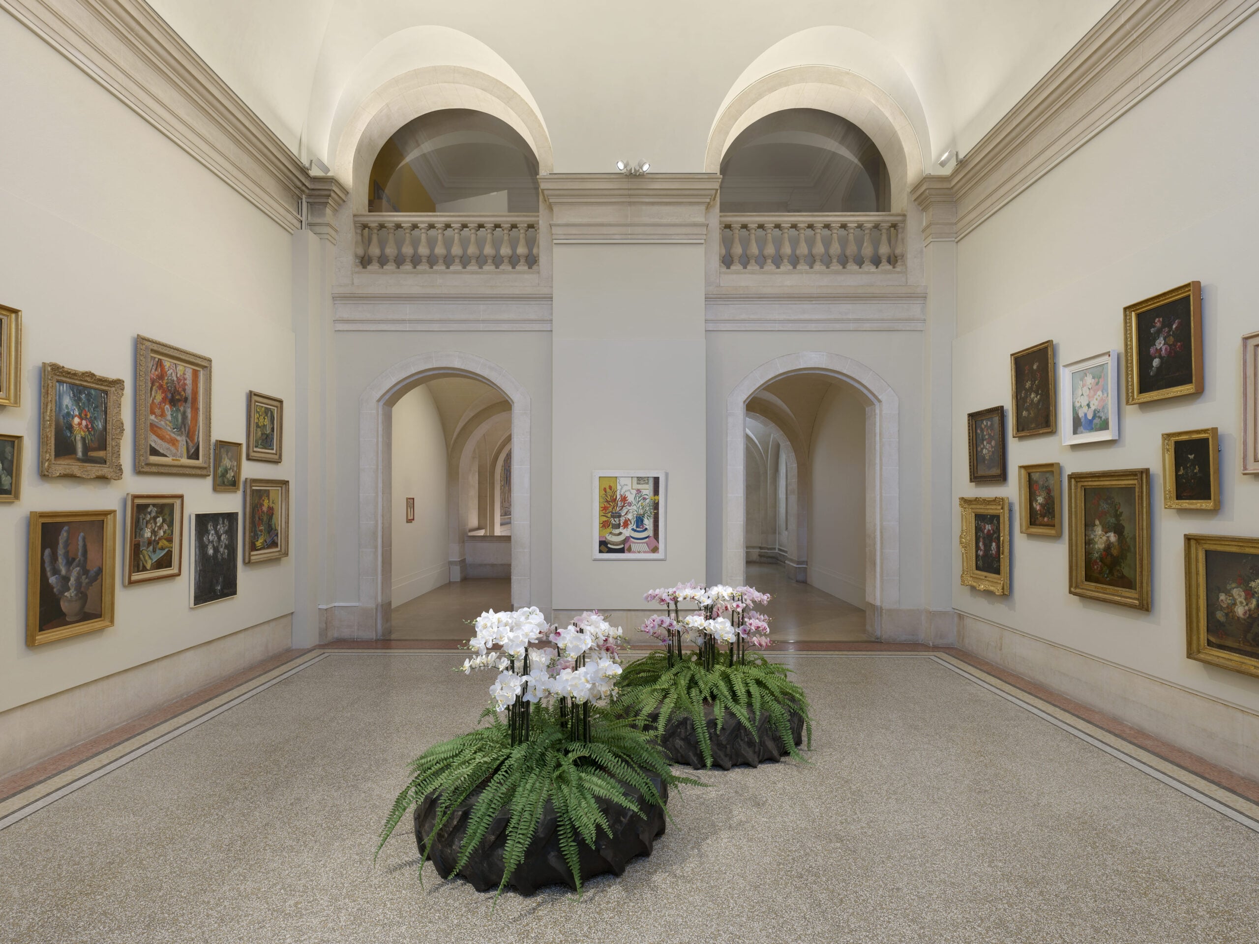 Una gigantesca palla stroboscopica che spezzetta la luce all’ingresso del museo; subito dopo, quadri minimalisti; e dopo ancora: vasi di orchidee montati su delle gigantesche ruote da trattore circondate da dipinti dei secoli scorsi raffiguranti fiori. E poi: curiosi strumenti musicali antichi (uno ricavato dal guscio di una tartaruga); abiti, altri quadri, quadri appesi a una gruccia come fossero abiti (Painting with coat hanger, per l’appunto, realizzato da Armleder nel 1984); luci a neon, un’opera dell’artista-curatore, gettate in un angolo che si fronteggiano con una selezione di lampade e abat jour storiche del museo. Attraversando le sale del MAH, la mostra pensata da Armleder sembra un insieme di mostre – e, incredibilmente, funzionano tutte.