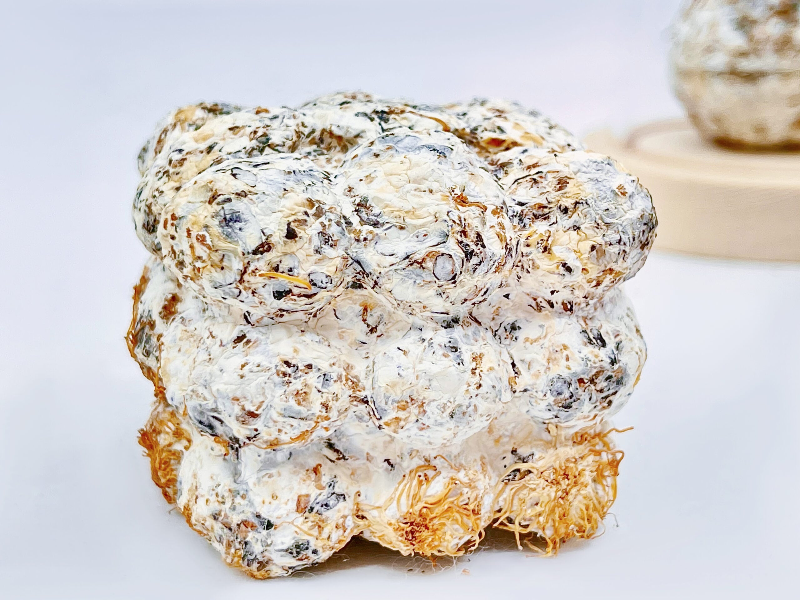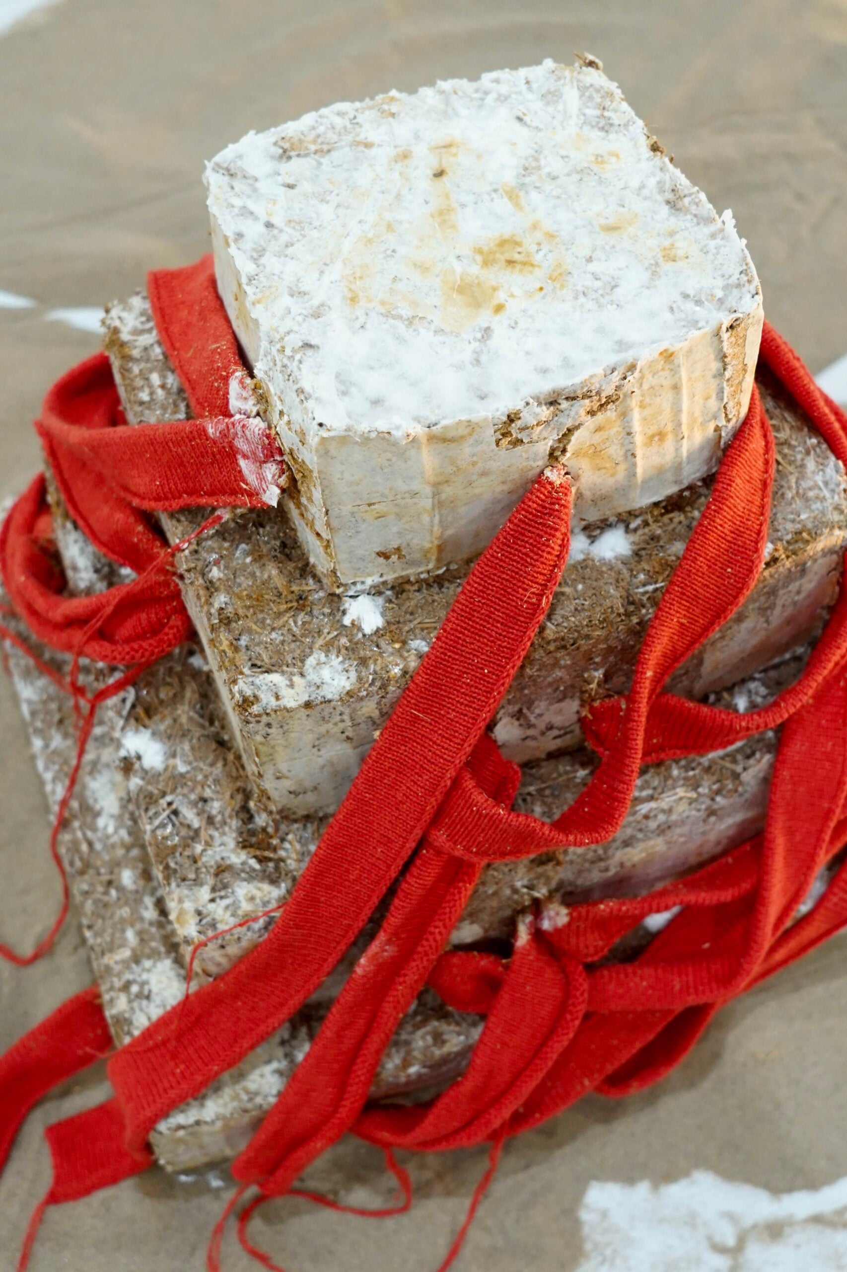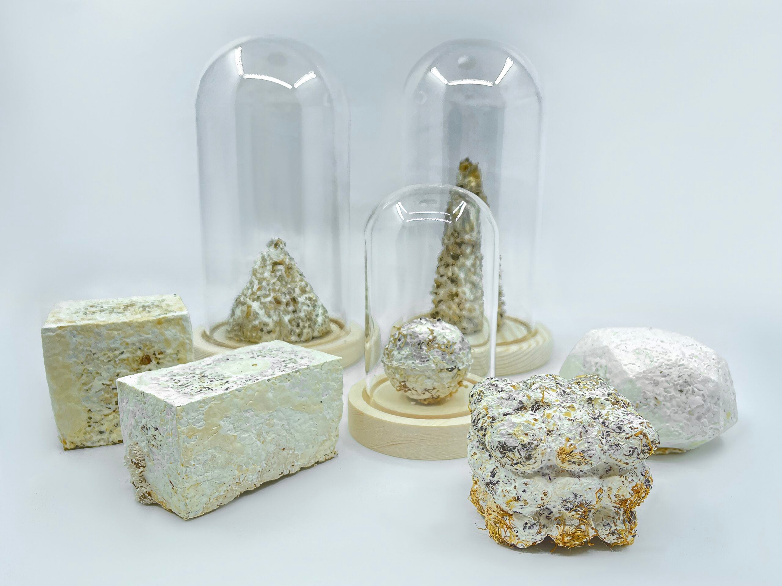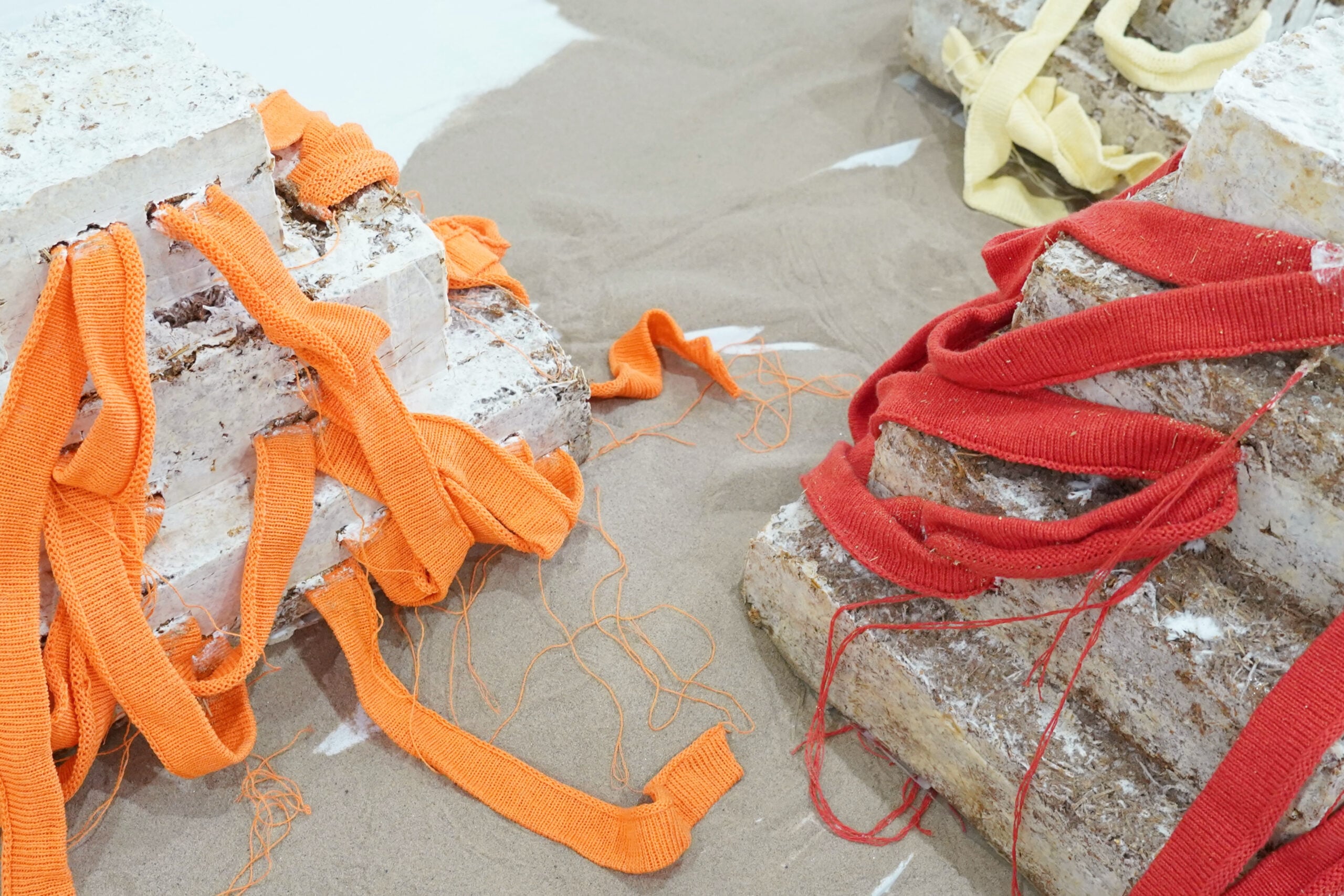 In progetti come After the Remains (2025), Zhang concepisce l’opera come un processo in continua trasformazione guidato dal tempo. L’installazione immagina un futuro sito archeologico in cui materiali artificiali e naturali convivono e si trasformano, dando vita a una narrazione non antropocentrica. Le sculture, simili a resti fossili, cambiano nel tempo attraverso cicli di decadimento e rigenerazione, rendendo ogni esperienza dell’opera imprevedibile e irripetibile. Al centro della pratica di Zhang c’è l’agency dei materiali viventi, che continuano a evolversi anche dopo la realizzazione dell’opera e partecipano attivamente alla costruzione di forma e significato. Questa visione si sviluppa in Symbiosis (2024), dove micelio, paglia e tessuti di scarto instaurano relazioni simbiotiche, trasformando il rifiuto tessile in parte del ciclo naturale e invitando a ridefinire i concetti di scarto e risorsa. Il tempo diventa medium anche in Life Touches Matter (2024), un’opera multisensoriale che supera la centralità dello sguardo coinvolgendo tatto e olfatto. Infine, Myceli-y-um-y Cube (2023) affronta il tema del cibo del futuro attraverso un’installazione che utilizza micelio e rifiuti agricoli come materie prime. L’opera sfida le percezioni di ciò che è commestibile, pulito o sicuro, invitando a ripensare il rapporto tra esseri umani e forme di vita non umane. Grazie a un approccio interdisciplinare tra arte e scienza, Zhang traduce la ricerca in ambito biologico e alimentare in un processo visibile e verificabile, trasformando il sapere scientifico in un linguaggio artistico accessibile e condivisibile.