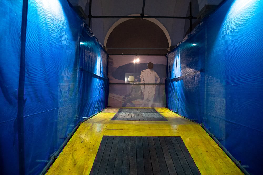 La Sala Anna Banti delle Murate è invece dedicata alla installazione di Heather Hart (Seattle, 1957), che si realizza nella forma ambientale che le è congeniale. “Mi concentro sulla traduzione tra spazio e pubblico, tra pubblico e mio lavoro, e sullo slittamento, la costruzione e la comunicazione che si verificano tra questi due mondi”, spiega l’artista. “Voglio che il mio lavoro interdisciplinare agisca come un traduttore in un linguaggio tra l’architettura e l’occhio del pubblico”. Ma mentre solitamente Hart va a intervenire nello spazio esterno trasformando la realtà qui, in Triplet Consciousness, è l’ambiente interno a modificarsi, sezionato, attraversato da rampe e impalcature, fino ad offrire un’area libera di incontro e meditazione, di riflessione e relazione, con la figura di Mercurio a fare da nume tutelare di ciò che avviene ed è imprevisto.