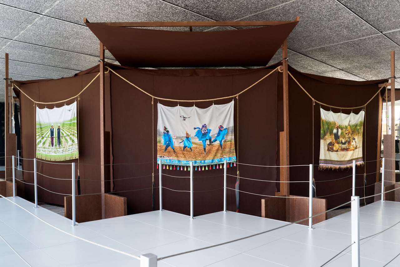 Al piano terra del Podium, il cuore espositivo di Fondazione Prada, i visitatori si imbattono in un ambiente composto da aree tematiche interconnesse. Al centro la struttura che riprende una tenda per la conservazione del riso. Al suo interno è proiettato il docu-film film con cui Cao Fei investiga l’evoluzione del rapporto tra esseri umani e territorio nella storia millenaria dell’agricoltura. In questo contesto, i droni incarnano uno “sguardo” sul paesaggio che amplia la percezione umana. Nel film il loro movimento si inserisce nel ritmo del ciclo che va dalla semina al raccolto, sottolineando l’interdipendenza tra manodopera e intelligenza automatizzata. Poco distante The Birth, una tenda, simile a un piccolo tempio, realizzata con sacchi di fertilizzante: ospita un video proiettato in loop, il serbatoio e le eliche di un drone e una serie di oggetti legati al raccolto. L’insieme descrive il paradosso di un prodotto industriale a cui gli agricoltori rivolgono offerte per ingraziarsi la sua efficienza. Un’area circondata da banani artificiali è, invece, allestita per partecipare a un gioco in realtà virtuale. Indossando un visore, è possibile assumere la prospettiva di un drone in volo che si muove tra paesaggi futuristici, geografie alterate e templi in rovina, proponendo una riflessione sui cicli di innovazione e obsolescenza tecnologica.