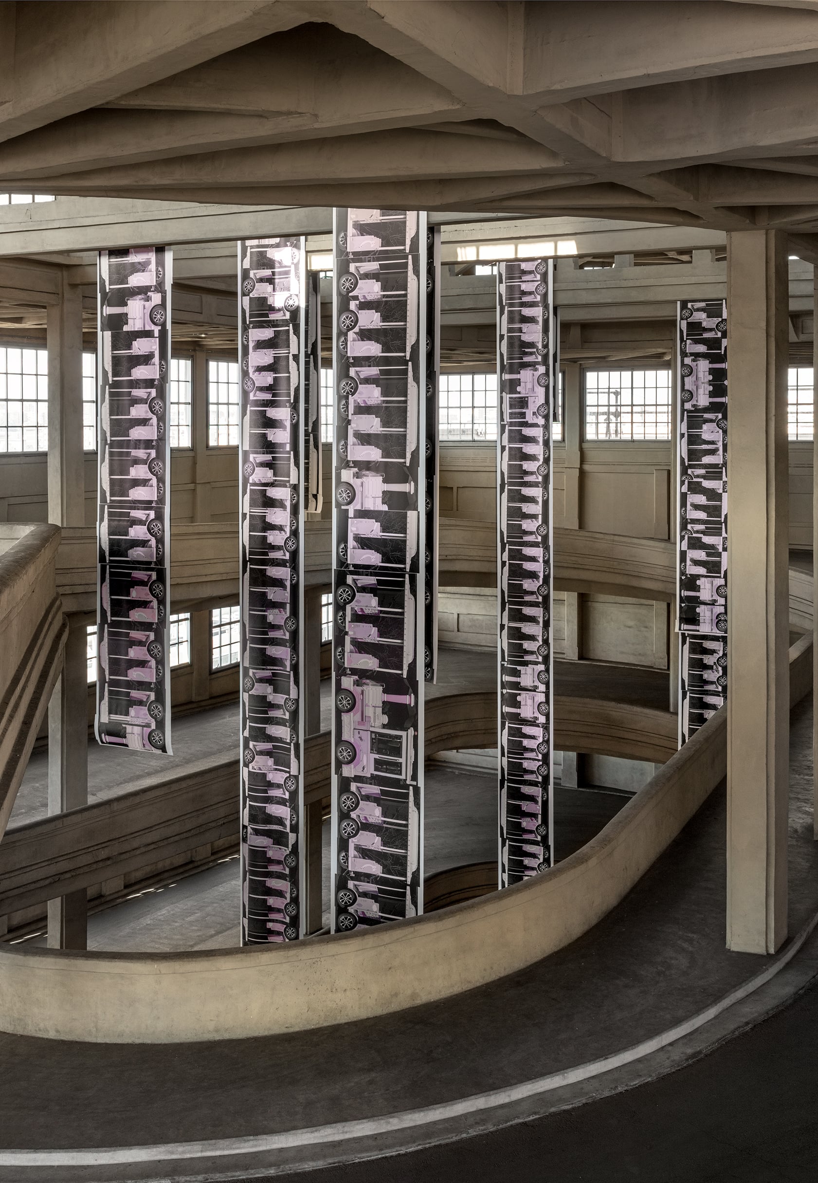 La Pista 500 continua invece a trasformarsi in un giardino sospeso dove arte e architettura dialogano con il paesaggio urbano. Due le nuove installazioni site-specific che ampliano il progetto. Con Bandiere per Zefiro (2026), Nathalie Du Pasquier (Bordeaux, 1957) interviene sulla facciata est con quindici gonfaloni che combinano astrazione geometrica, colori vivaci e accenni figurativi, attivandosi grazie al vento occidentale evocato dal mito di Zefiro. L’opera gioca con l’immaginario delle istituzioni internazionali, ma ne ribalta il significato qui intesi come strumenti di apertura e dialogo. Diverso è, infine, l’intervento di Peter Fischli (Zurigo, 1952), che con ADDITION, SUBTRACTION, MULTIPLICATION (2026) occupa la rampa ellittica dell’edificio. L’artista prende spunto dai trenini turistici su ruote per poi decostruirli: vagoni capovolti, inutilizzabili, disposti lungo un percorso impossibile. Il risultato è una narrazione interrotta, che mette in crisi l’idea stessa di viaggio. L’installazione crea una connessione simbolica tra la base commerciale del Lingotto e il suo vertice culturale, suggerendo una riflessione sul rapporto tra produzione industriale e consumo culturale. Non a caso, la frammentazione visiva richiama le sperimentazioni futuriste, in particolare quelle di Giacomo Balla, già presenti nella collezione della Pinacoteca.