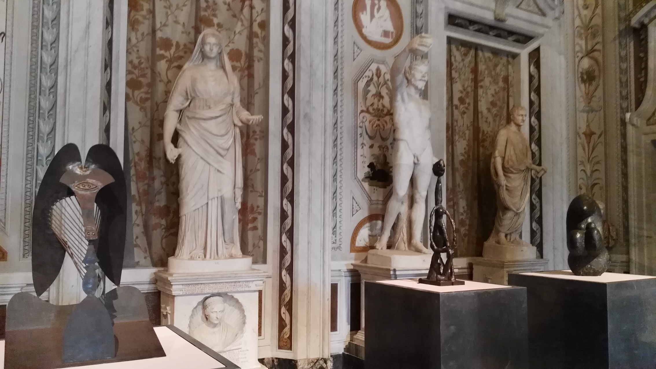 Ma ecco che la lettrice (1951) di Picasso ha la stessa posa di Paolina Borghese Bonaparte nelle vesti di Venere vincitrice (1804) di Antonio Canova, che la Donna seduta (1958) sembra levarsi una spina dal piede come nell’opera Cavaspina di Anonimo del XVI secolo. Interessanti sono anche le fotografie che collocano le sculture viste in mostra nel luogo in cui sono state realizzate e vissute dall’artista. È uno scatto realizzato a Cannes nel Natale del 1956 che ritrae Picasso con la scultura la capra, esposta in dialogo con la capra Amaltea con Giove bambino e un faunetto di Bernini, ed Esmeralda, la capra ricevuta in dono da Jacqueline. Come scrive il direttore Anna Coliva nel suo saggio “Picasso Scultore. Enorme Flamme nella Galleria Borghese”, presente in catalogo: “(…) Nessun’altra scena espositiva quanto la Galleria Borghese, proprio per i caratteri di primato ideale della scultura pur nella massima varietà di specie che vi sono contenute, dalla statuaria antica alla disseminazione ornamentale del Settecento, è in condizione di offrire un rilievo così universalmente percepibile della funzione titanica di Picasso nel risolvere il problema moderno della plastica e della tridimensionalità volumetrica della forma. Esporre le opere di Picasso in scultura quali vertici cruciali di soluzione delle sue rivoluzioni della forma rende la Galleria uno spazio metastorico e realizza quella trasposizione di tempo e di spazio che, per le sue intenzioni originarie, essa contiene in potenza nelle sue collezioni. (…)”