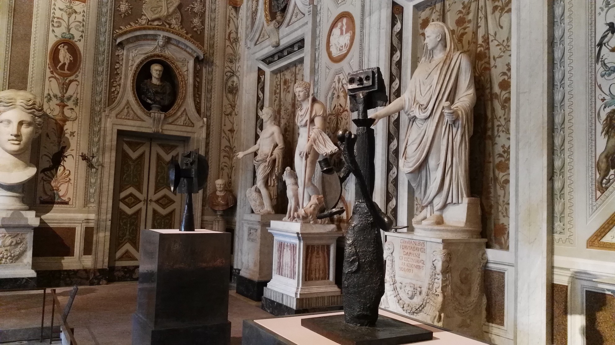 Possono le sculture di Pablo Picasso dialogare con il patrimonio artistico della Galleria Borghese? È quello che Anna Coliva e Diana Widmaier-Picasso hanno egregiamente fatto, curando Picasso. La scultura, mostra appena inaugurata alla Galleria Borghese a Roma. Un dialogo facilmente riconoscibile che pone in relazione le sculture, di materiali diversi, di Picasso con i capolavori dei Maestri. Con un percorso che affronta vari temi, vengono presentate le opere dell’artista spagnolo, che visitò la Galleria Borghese durante il suo viaggio in Italia nel 1917. Il primo confronto diretto si ha nel salone d’ingresso tra le sculture in bronzo e cemento di Picasso, raffiguranti teste femminili e maschili, con l’arte romana e i busti di Gian Battista della Porta: un intervallarsi su diversi piani di profondità, di opere di epoche e materiali diversi che sembrano essere state sempre messe in relazione. Il dialogo tra i vari capolavori è sempre più evidente sala dopo sala: nella sezione Metamorfosi della materia la scultura in lamiera di Pablo Picasso, Donna con il bambino (1961), viene presentata insieme a quella marmorea di Gian Lorenzo Bernini, Apollo e Dafne (1622/1625).