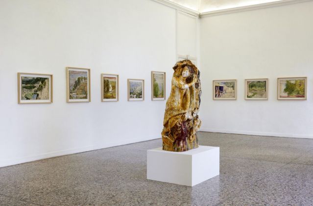 E quindi una terracotta biscotto del 1945 di piccolo formato e una straordinaria cera persa del 1950 con una Madonna incinta. Un’iconografia piuttosto rara. La donna è annoiata, abbandonata su se stessa, in attesa. Un oggetto che risente della lezione dei maestri, di Medardo Rosso in primis.