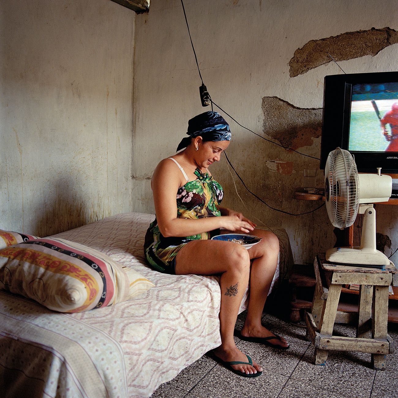 Il suo è un lavoro lontano da quella retorica della miseria che potrebbe segnare un’indagine di questo tipo. Le persone, soprattutto donne, molti anziani, bambini, sono colte nei loro ambienti domestici, pieni di oggetti, di cose di diverso tipo. Vi sono perlopiù vecchi palazzi ex coloniali, cadenti che ospitano situazioni fra le più diverse. Pare talvolta di trovarsi all’interno di piccoli mercati bric à brac in cui le cose assumono un valore sentimentale.