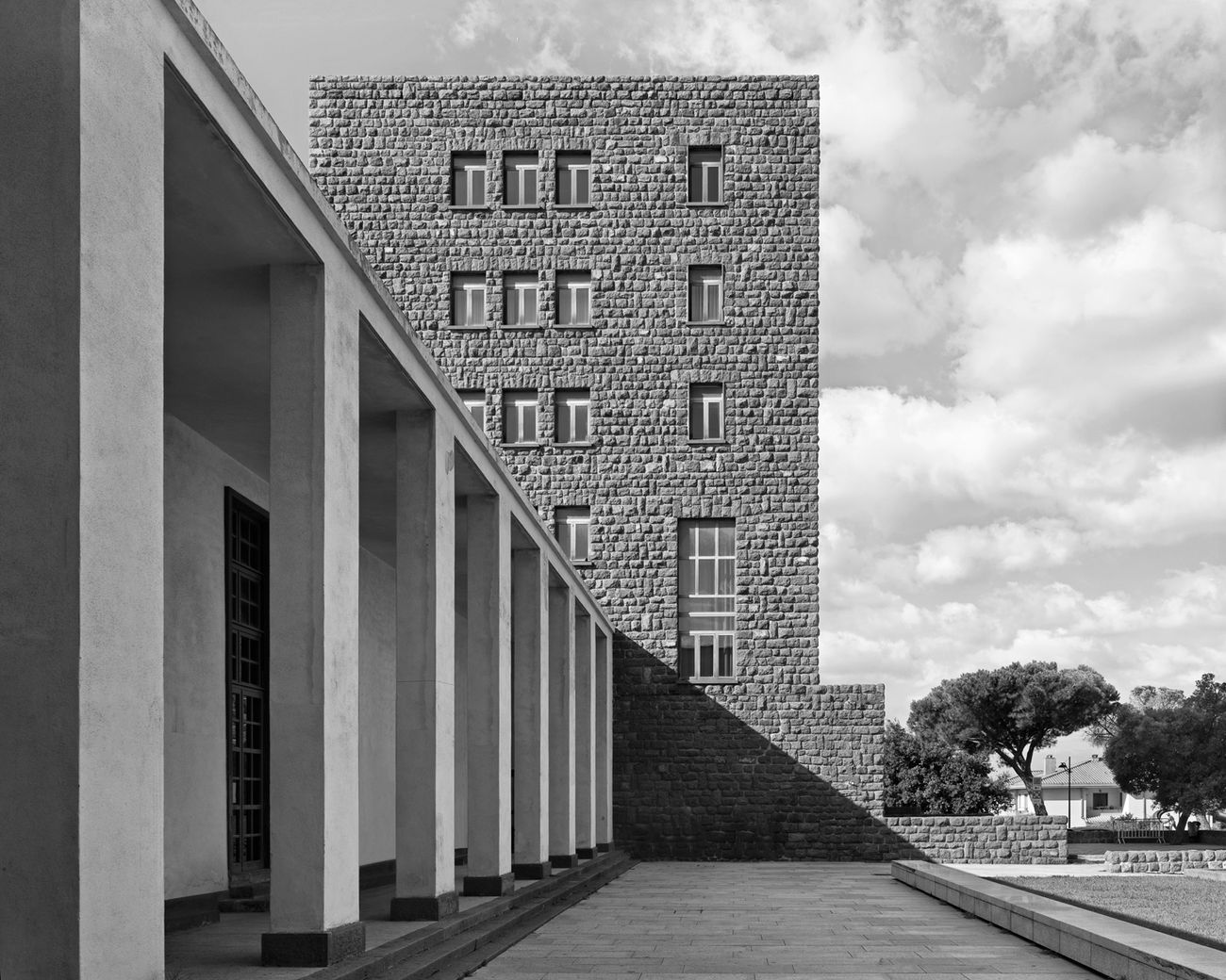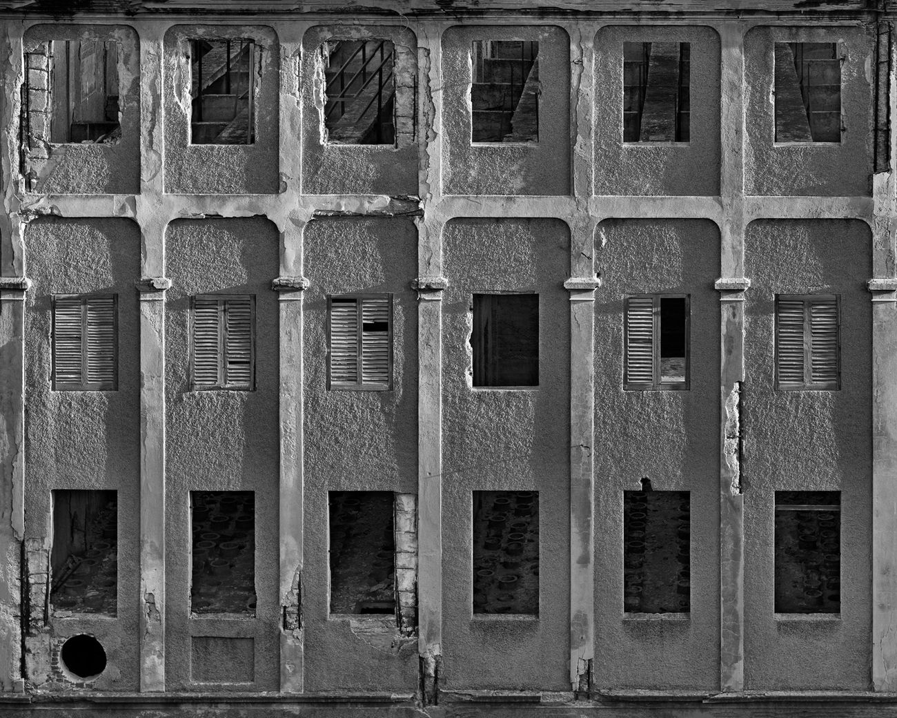 Non è il panorama che si coglie da quella angusta bocca di lupo bensì il punto di vista obbligato di Totò Riina dalla branda della sua cella a rapire l’attenzione di Pino Musi (Salerno, 1958), che si concentra sulla restituzione di una sintesi a favore di un approccio estetico più che documentaristico. Ed ecco che a quell’apertura si allineano i volumi rigorosamente geometrici di una lastra con sgabello e di uno stipetto che, in uno sguardo d’insieme, non possono non ricordare il Suprematismo maleviciano. Punti di vista e tagli fotografici inconsueti, uniti al rigore e alla razionalità delle strutture, soprattutto quelle d’epoca fascista, sono congeniali a creare una forma di astrazione visiva.