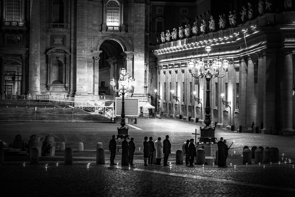 “Questo virus ci sta cambiando profondamente. Sono stato in rispettosa quarantena per ventotto giorni e non avevo alcuna voglia di fotografare quello che stava accadendo fuori. Ieri ho cambiato idea, ho sentito che dovevo andare e vedere con i miei occhi quell’evento straordinario”. Sono parole di Giovanni De Angelis, fotografo originario di Napoli, tra i più quotati per il suo stile inconfondibile, che cattura la realtà in un bianco e nero profondo e misterioso. Come lo sono gli scatti realizzati in occasione della Via Crucis del Venerdì Santo che, per la prima volta in quasi sessant’anni, non si è svolta al Colosseo, chiuso per la pandemia, ma in una piazza San Pietro completamente vuota, sotto lo sguardo vigile di Papa Francesco, raccolto nel silenzio come durante la scenografica preghiera del 27 marzo 2020. Per oltre un secolo, fino all’Unità d’Italia, il Colosseo è stato, infatti, la meta del rito cattolico che commemora il percorso doloroso di Gesù Cristo verso la crocifissione sul monte Golgota.