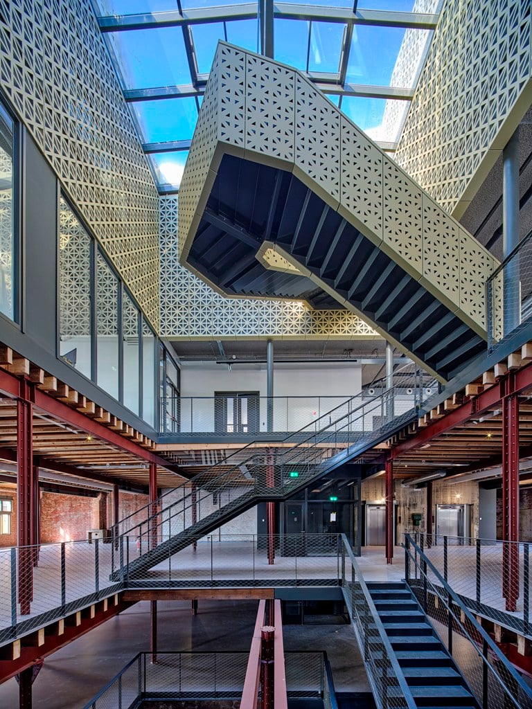 Progettato dagli architetti J.P. Stok Wzn e J.J. Kanters, l’edificio fu inaugurato nel 1902 come magazzino per il caffè importato dal Brasile, ed è uno dei meglio conservati dei Paesi Bassi. Per la ristrutturazione, gli architetti RENNER HAINKE WIRTH ZIRN ARCHITEKTEN di Amburgo e WDJARCHITECTEN di Rotterdam, si sono concentrati sul ripristino della maggior parte strutturale e storica possibile. Quando possibile, sono stati restaurati gli elementi esterni e interni esistenti della costruzione originale del magazzino, risalente al 1901-1902. Sono stati mantenuti i sei piani originali dell’edificio, con una struttura a colonne in ghisa, insieme a un ampio seminterrato sottostante l’intera superficie dell’edificio. Al centro del progetto c’era l’impegno di trasformare gli spazi interni bui dell’edificio in uno spazio luminoso senza compromettere il carattere originale del magazzino. Un nuovo atrio centrale permetterà alla luce naturale di illuminare l’intero edificio e collegherà il piano terra all’ultimo piano con una scala centrale che attraversa l’edificio. Nell’ambito della ristrutturazione, sono stati mantenuti i sei piani originali dell’edificio, con una struttura a colonne in ghisa, insieme a un ampio seminterrato sottostante l’intera superficie dell’edificio. Per preservare il più possibile gli interni storici, i condotti dell’aria condizionata, i cavi elettrici, i binari dell’illuminazione e le tubature sono stati in gran parte incorporati tra le travi in legno originali del soffitto.