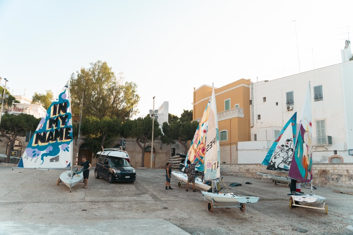Won abc, Made514, Satone, Cento Canesio e V3rbo hanno infatti dipinto le vele delle imbarcazioni che, guidate dai giovani ragazzi dagli 11 ai 18 anni della scuola agonisti della Lega Navale, hanno costeggiato il Castello di Carlo V per poi raggiungere il Faro Rosso di Monopoli, Spiaggia Cala Porta Vecchia e, successivamente, lo Skeleton Valley skatepark di Monopoli fino alla Lega Navale. Ecco le immagini