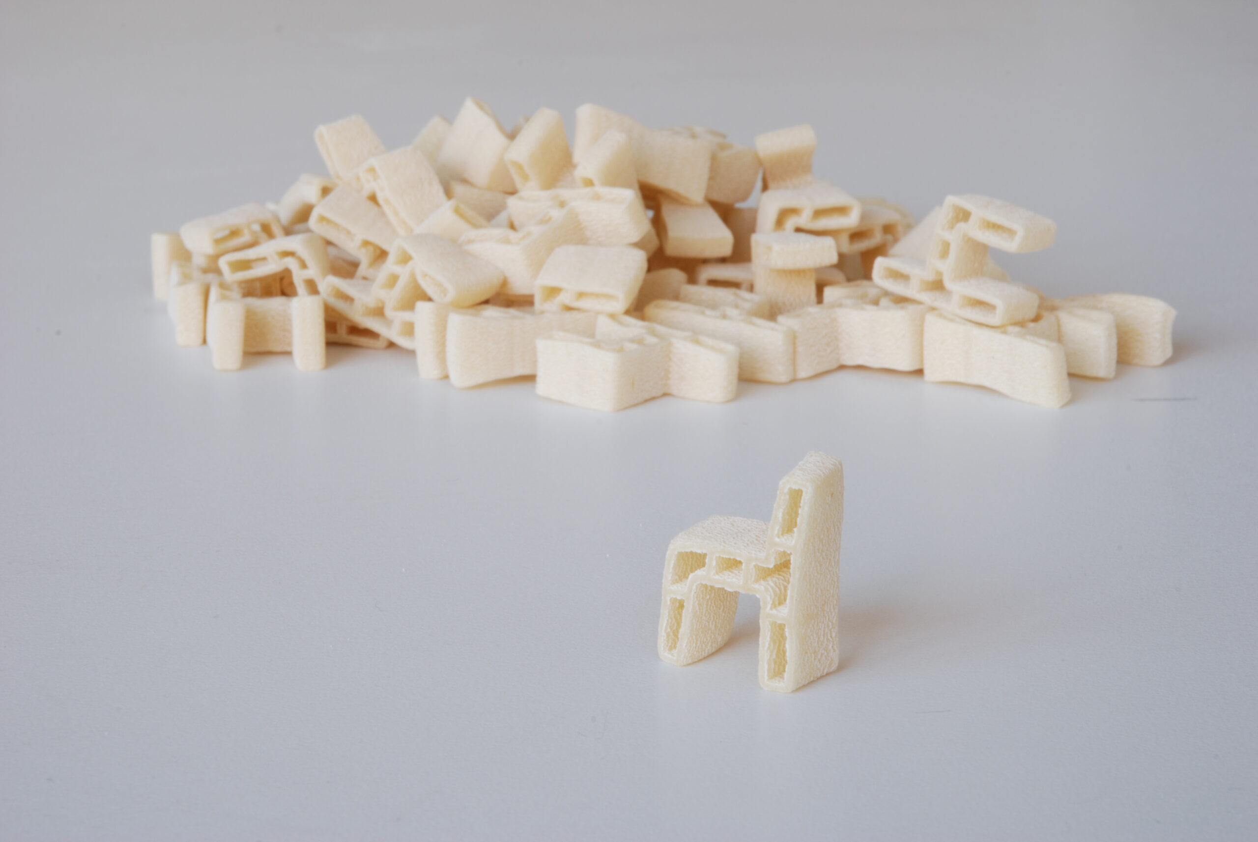“Alludere al cibo” raccoglie tutti quegli oggetti non commestibili che hanno però preso in prestito dal mondo alimentare le loro fattezze, come gli Scampi di David Bielander. “Cibo come materia” incarna la fase più sperimentale del cibo, quando gli alimenti vengono utilizzati come vere e proprie materie prime, argille con cui dare forma agli oggetti. Basti pensare al progetto del duo Formafantasma, Autharchy: un’intera collezione di componenti da tavola – brocche, piatti, ciotole – plasmata con farine, spezie e colle alimentari.