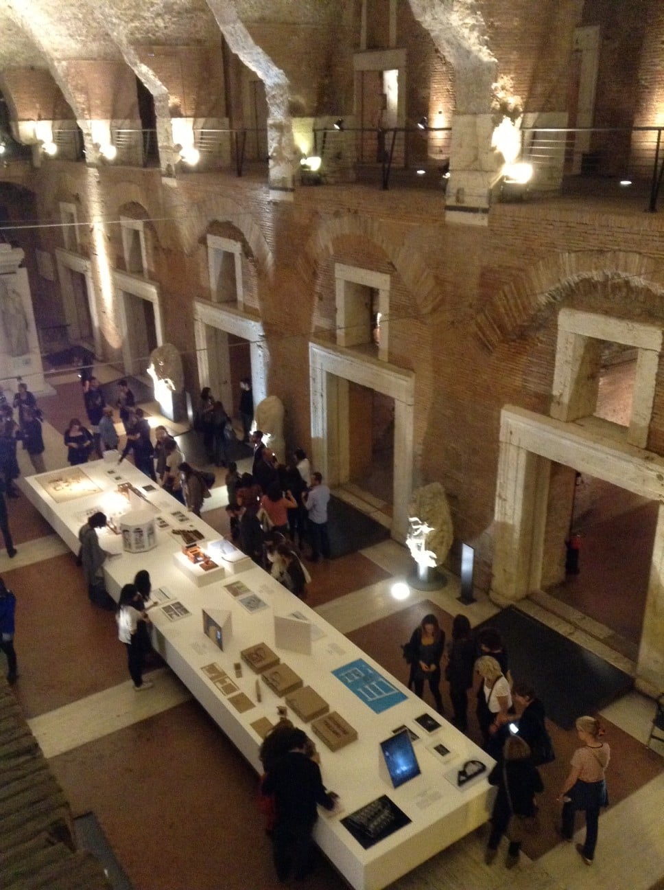 E in effetti gli allestimenti proposti sono ambiziosi e a tratti utopici. C’è chi, come la proposta I’m a monument, lavora sulla comunicazione visiva sovrapponendo immagini e grafiche di periodi storici diversi a creare un forte impatto con la preesistenza. Altri si concentrano sul tema del low-cost usando, come espositori, elementi di cartone componibile, pallets e scatole di legno (quelle comunemente usate per il trasporto delle opere) come il caso di Scoprire Traiano e Work in progress. Poi c’è chi si basa su un approccio minimal in cui la luce, e quindi il buio, è l’unica protagonista insieme alle opere d’arte. Ne sono due esempi Ombre e Luci e ombre di un imperatore, in cui l’allestimento sembra scomparire creando un’atmosfera di scoperta estremamente suggestiva. Altri, infine, tentano di ricreare un nuovo paesaggio in rapporto dialettico con l’impianto esistente come Forza di gravità, Points of view e Acqua, in cui il percorso espositivo è circondato dall’acqua dove l’architettura antica si specchia.