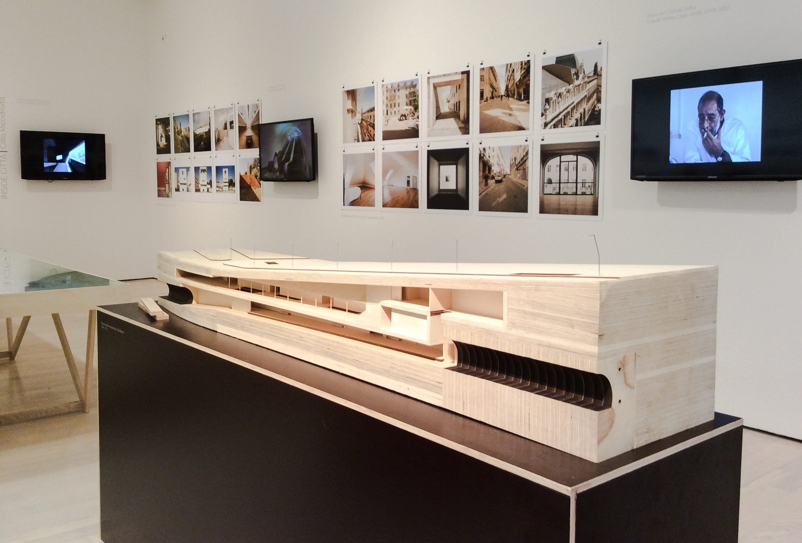 Il percorso espositivo racconta l’itinerario artistico e professionale dell’architetto legandolo a filo doppio con la storia del suo Paese, il Portogallo, uscito da un lungo periodo di dittatura, con la sua formazione e con l’eredità dei suoi luoghi d’origine, per evidenziare la pazienza con cui Siza è riuscito a equilibrare il rapporto tra architettura, misura umana e paesaggio che la ospita. Le scelte allestitive non lasciano dubbi: i disegni e le foto sono appesi come se fossimo in studio. La sala del Mart, completamente svuotata da qualsiasi interruzione visuale, si apre in un colpo d’occhio unico, che si perde tra disegni, plastici, video. I grandi tavoli mostrano, senza sovrastarla né contraffarla, la storia della maestria e dell’eleganza dell’architettura portoghese, leggera e decisa. Sullo sfondo il giardino delle sculture del museo e le montagne che lo circondano.