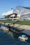 L’ambiziosità dell’edificio progettato da Coop Himmelb(l)au probabilmente continuerà a dividere; si tratta di un gesto architettonico eclatante e vertiginoso, ammirevolmente coraggioso ma anche sfrontato. Nel punto di congiunzione dei due fiumi che attraversano Lione (il Rodano e la Saona) sorge un enorme palazzo di vetro e acciaio, dalla forma indefinibile: un parallelepipedo esploso, un animale gigante, una navicella spaziale… Diviso in due parti: il “cristallo” di vetro ospita l’ingresso, la libreria e tutti gli spazi di corredo, la “nuvola” di acciaio, soprelevata, accoglie invece le sale per l’esposizione.