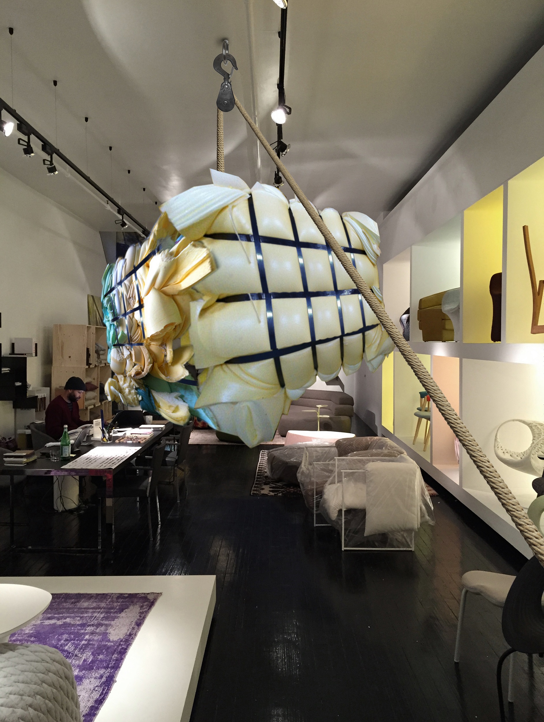Smile l’approccio di Alis / Filliol, che propone la costruzione di una o più sculture realizzate con i prodotti presenti nello showroom, ma ricorrendo a una efficace suggestione (fanta)scientifica: vittime di una forza magnetica concentrata al centro della stanza, oggetti disparati finiscono con l’assemblarsi in forme compatte, tenute insieme da semplice nastro adesivo. Nuclei informi, carichi di tensione.