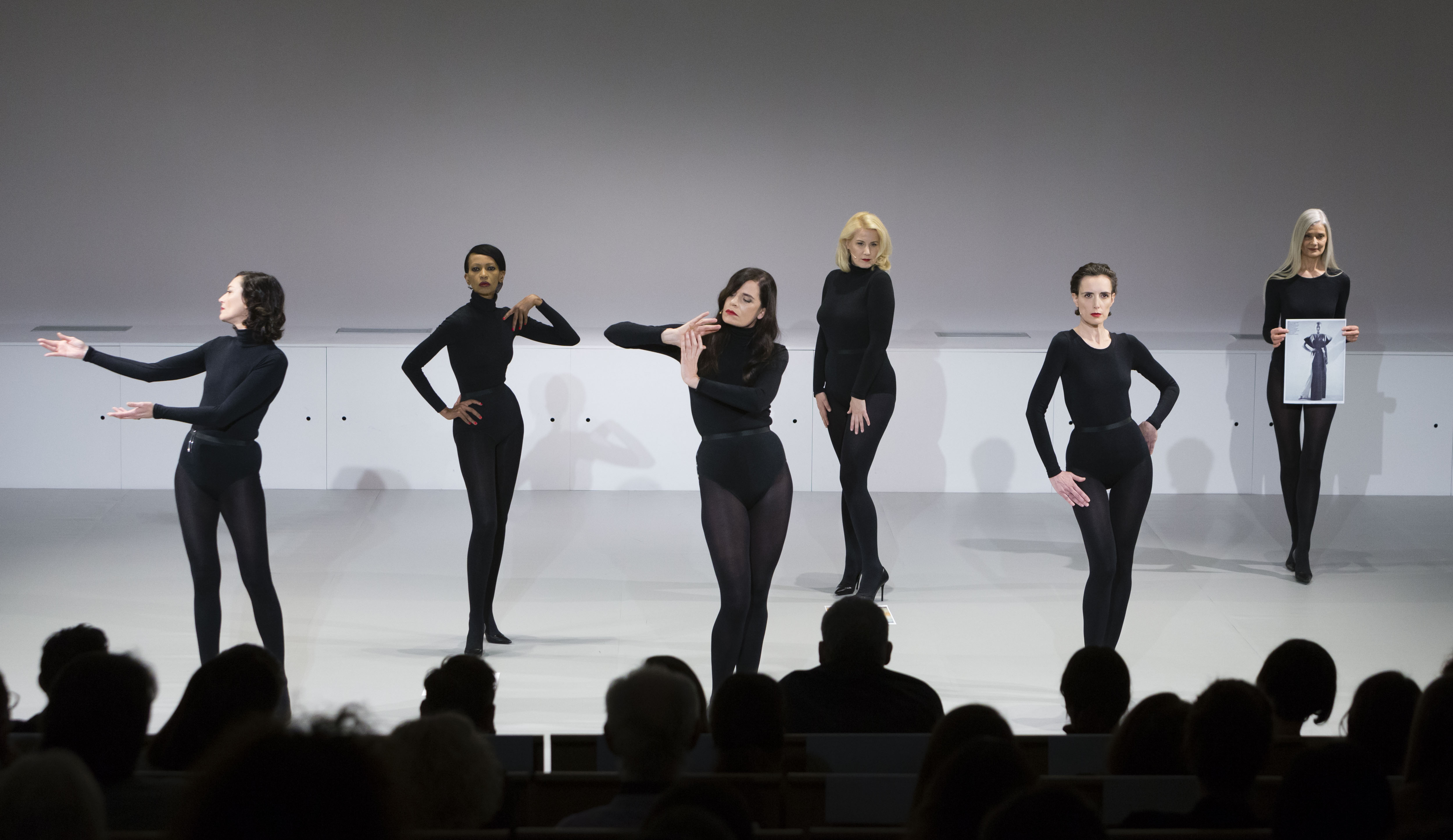 Icone dell’alta moda nei fervidi Anni Ottanta – e testimonial di griffe eccellenti come Yves Saint Laurent, Jean-Paul Gaultier, Dior e Comme des Garçons – Christine Bergstrom, Axelle Doué, Charlotte Flossaut, Claudia Huidobro, Anne Rohart, Violeta Sanchez e Amalia Vairelli si impossessano dello spazio con la loro presenza e la loro voce. Vestite di un essenziale total black e di un altrettanto minimale tacco a spillo, le modelle simulano il ricordo degli abiti indossati, evocandone le fattezze attraverso gesti puntuali. Sulla scia dei loro racconti, pare di sentire il fruscio delle stoffe in lontananza e di vedere colori e forme prendere vita sullo sfondo nero delle silhouette. La memoria di un passato glorioso irrompe nel presente, lasciando uno strascico di malinconia, emozione e leggerezza, che non cede il passo al rimpianto dei tempi andati, ma regala una concretezza “viva” al corpo delle modelle e a ciò che indossano.
