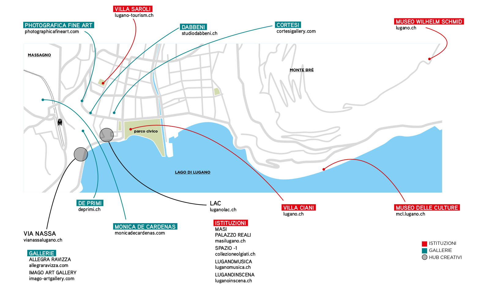 Ma via Nassa negli ultimi anni è diventata anche sede di gallerie d’arte. Se è durata poco la permanenza di Sperone, rimangono Allegra Ravizza e la Imago Art Gallery. Uscendo da via Nassa ci sono poi, fra gli altri Cortesi, Studio Dabbeni, De Primi, Photografica Fine art e Monica de Cardenas che, dopo la prima sede svizzera a Zuoz, ha aperto anche a Lugano. Ad Agra, poi, nelle immediate vicinanze, c’è un nome importante come Buchmann.