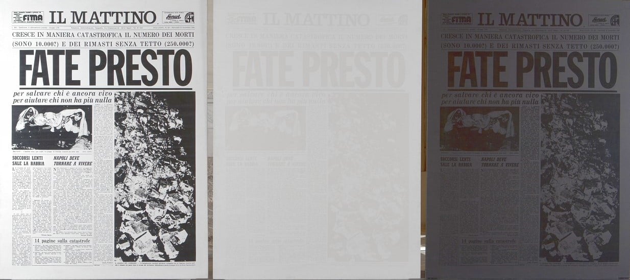 La fotografia, difatti, restituisce la realtà anche quando è spiazzante: il pianto disperato dell’anziana donna che con una mano soffoca il proprio grido nel mezzo delle macerie, è un’immagine potente e drammatica, un sopralluogo antropologico della memoria, di un tempo che oggi appare lontano ma che diviene un memento mori. Addormentarsi, cercare un riparo sicuro, un momento di riposo nel mezzo delle macerie o, accatastare un corpo morto sulla terra nuda, di cui si percepisce quel profondo solco che ha diviso e inghiottito le vite, esprime quanto denunciato dalla riflessione concettuale di Andy Warhol che individuò fra le tante stampe la richiesta di intervento “Fate presto” tratto dal “Il Mattino” pubblicato il 26 Novembre del 1980, realizzando un gigantesco trittico che fu poi esposto in occasione della mostra voluta da Lucio Amelio, Terrae Motus. Quest’ultima non fu una semplice risposta culturale al sisma, ma un messaggio semantico: un gesto curatoriale che trasformò la frattura tellurica in frattura di significati, convocando l’arte a restituire ciò che la terra aveva distrutto nel linguaggio stesso del mondo.