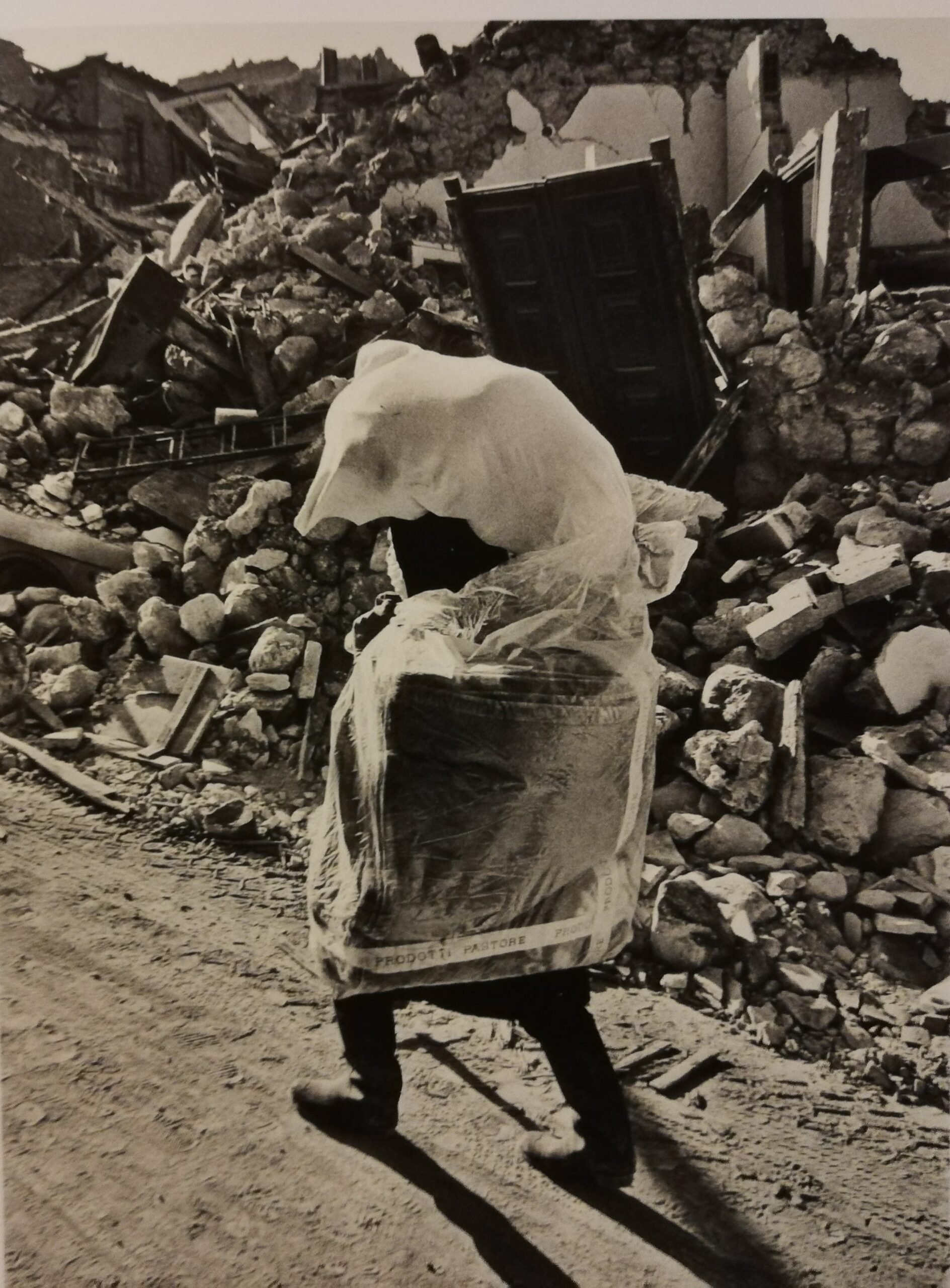 Le Italie di Luciano Fabro, capovolte e unite alla punta dello stivale e tenute da cavi d’acciaio, sintetizzano simbolicamente il paese che tremò, ed è proprio in quella frattura che si innesta il pensiero di Vito Teti: ciò che rimane, i paesi svuotati, le rovine abitate, le comunità che resistono, non è il residuo di un Italia perduta, ma una condizione minima per continuare a restare, per non spezzare del tutto il filo sottile che lega ancora le persone ai loro luoghi. È allora profetico, in questo senso è il fotogramma di D’Alessandro, in cui un terremotato a Sant’Angelo dei Lombardi percorre un cammino nuovo tra le macerie, portando con sé quel che resta di una vita che fu. In quella figura solitaria si addensa tutto il lutto dell’Irpina: i volti che non riappariranno più, le case svanite, i nomi inghiottiti nella notte del 23 novembre. È una memoria che non consola e non pacifica, è una ferita che continua a pulsare nel paesaggio e nelle generazioni.