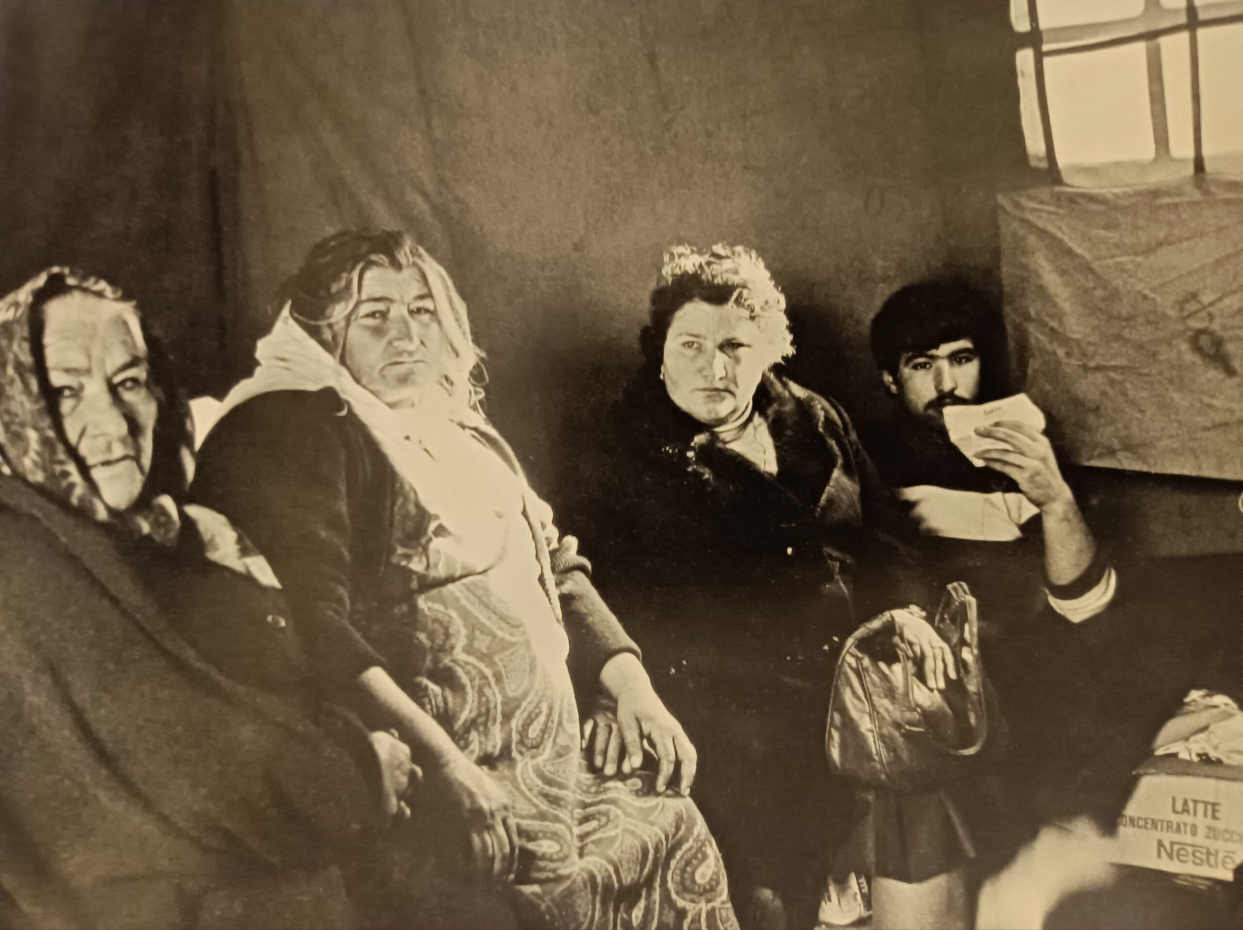 Proprio dentro questo gesto rituale, dentro questa volontà di salvare un frammento di presenza dal vortice del nulla, nasce una delle immagini più emblematiche di quei giorni, scattata da Luciano D’Alessandro (Napoli 1933 – Napoli 2016), in cui il lutto collettivo prende forma: in una tenda di un prefabbricato, in un riparo costruito in fretta, un gruppo di sopravvissuti siede ravvicinato, come se il dolore stesso li avesse costretti a stringersi. Un giovane uomo beve il latte direttamente dalla confezione di cartone, una donna poggia una mano sulla propria borsa e con l’altra, sfiora il corpo della sua vicina. Una vecchia in primo piano, con il capo coperto dallo scialle, dal fazzoletto del lutto, ha le mani serrate e la bocca socchiusa, quasi a bisbigliare qualcosa di incomprensibile, un cenno di vita, oramai disperso nel tempo labile della memoria. Hanno lo sguardo perso, immobile, perché la devastante scossa di terremoto che sì abbatté nei territori fra la Campania, l’Irpinia e la Lucania, fino a raggiungere la Puglia settentrionale, non solo sgretolò interi paesi, con le proprie architetture e le proprie genti, ma frantumò anche le biografie dei rimasti, riverberandoli in una condizione precaria, in cui l’uomo si confrontò pesantemente con la potenza distruttrice e divoratrice della natura. Attraverso questa indagine nei territori colpiti dal sisma, la fotografia, intesa come medium antropologico, è nell’indagine visiva di D’Alessandro, solo per citare uno fra i tanti, una peculiarità complessa e acuta: il sisma si manifesta come archetipo del ritorno al caos originario, un’ombra collettiva da cui scaturisce sempre una possibilità di rinascita.