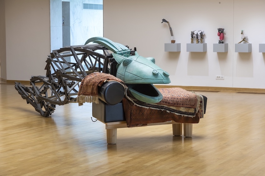 Ad aprire il percorso di questa eccezionale esposizione sono, in esterna, nell’ampio parco Šumarice (a Kragujevac) che ruota attorno al museo progettato dal duo Ivan Antià | Ivanka Raspopovià (duo che ha avuto vita breve ma di intensa progettualità), Brandeburg Gate (2020-22) e il colossale Bring me Back (2020-22) dove troviamo non solo una immediata visione d’insieme che mescola eventi in un modo del tutto personale, ma anche la chiara riflessione di un occhio che seziona e che si diverte nel trovare e nel tracciare vie di fuga, percorsi linguistici paralleli, ironici e pungenti. Allacciata a un double-decker bus inglese, la testa di cavallo che svetta sul colossale Bring me Back è, ad esempio, quella di Selene sottratta al Partenone nel XIX secolo e che attualmente è custodita presso il British Museum di Londra: e l’intento dell’artista (davvero fantastico, taglientemente scherzoso) è di rappresentare una utopica situazione postcoloniale, ovvero la fiabesca restituzione al Partenone della testa del cavallo trasportato nel suo luogo d’origine, Atene, nientemeno che dal tipico bus londinese.