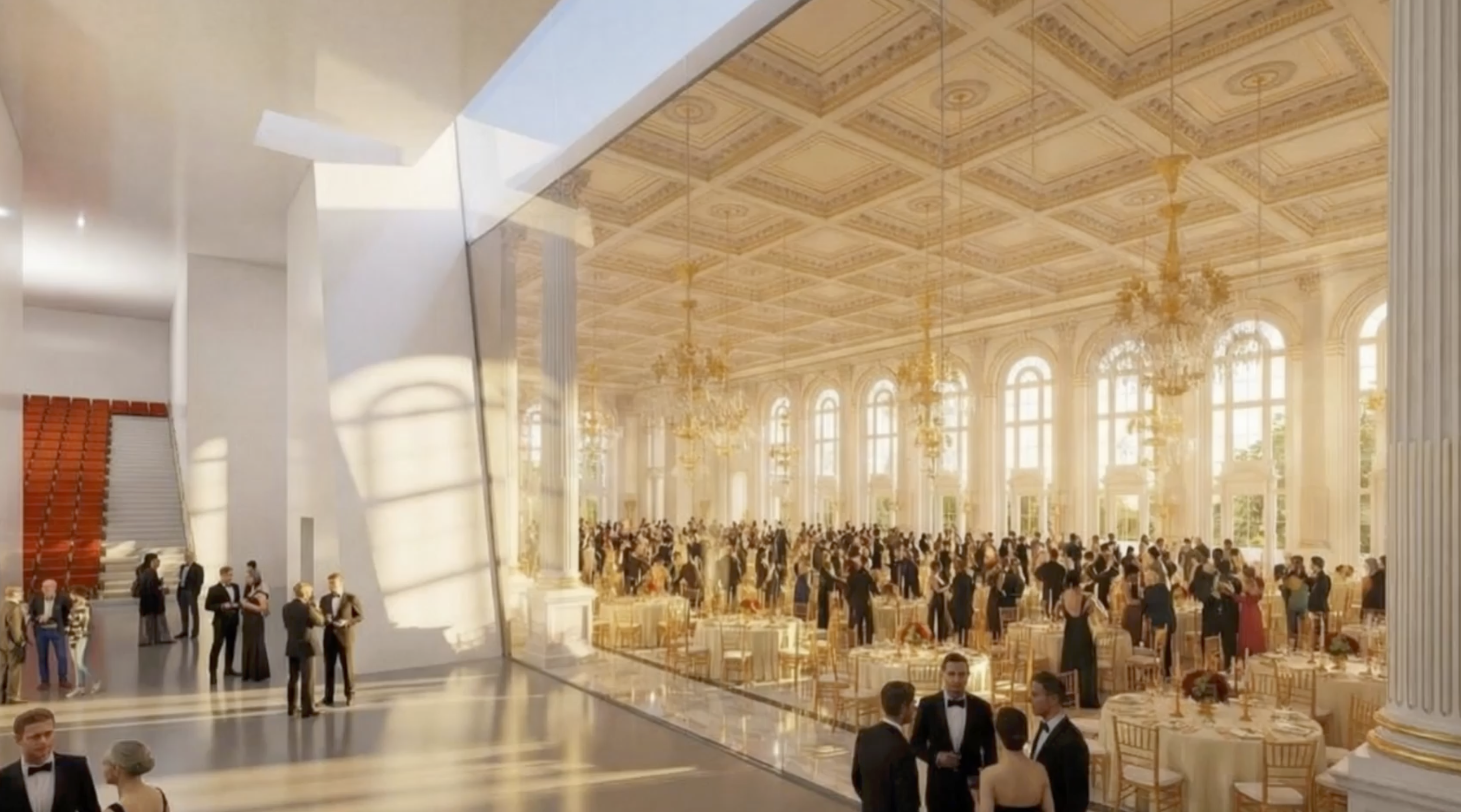 Il rendering del complesso restituisce un’architettura monumentale e fortemente simbolica, dove il dispositivo espositivo si intreccia con una precisa strategia narrativa: quella della celebrazione del Presidente e della sua famiglia. Nella grande hall al piano terra campeggerà una riproduzione dell’Air Force One, collocata come fulcro scenografico dell’intero percorso. Attorno a questo si svilupperanno ambienti espositivi, una vasta sala conferenze, sale per ricevimenti e una serie di spazi pensati per eventi e attività istituzionali, immersi in un sistema di aree verdi.