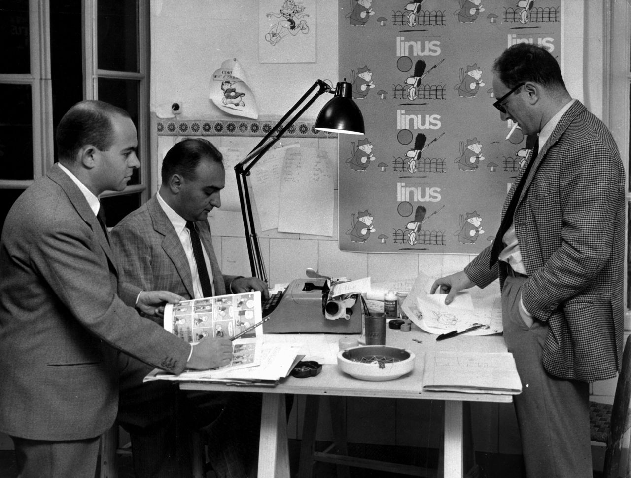 La cultura del ridere, ecco la parola d’ordine. Ma che bei tempi, allora era più possibile e più facile, ci si credeva davvero, in gruppo, e senza problemi di coscienza. Linus era la capitale internazionale – e infatti fu ripetutamente copiata all’estero, a cominciare dalla famosa Charlie costola del pugnace gruppone parigino di Hara-Kiri – della Vita col Sorriso. Prima o poi ci arrivavano tutti i migliori del momento: Ralph Steadman dalla Gran Bretagna, Jean-Michel Folon dal Belgio, Bob Blechman dagli Stati Uniti, Jean-Claude Forest e Alain Resnais e Georges Wolinski dalla Francia… I soci fondatori, meneghini avventurosi, sguinzagliati per le capitali del gusto e dell’intellighenzia planetaria, riportavano in redazione – e da lì, tramite le pagine del giornale, nelle nostre camerette di sognatori – le meraviglie di quel mondo contemporaneo in fermento. Ma se li frequentavi a casa loro, non solo dagli angelici coniugi Gandini nel loro bell’attico di via Montebello, o dal caro notaio Cavallone nell’austero studio di via Annunciata, o nell’elegante rifugio del Neri Carano in corso Monforte, ma anche nei bar qualunque del centro, ti potevi ritrovare ora a bere con il parigino polacco Roland Topor o con il panico-ispanico Fernando Arrabal, ora a chiacchierare con il londinese asciutto Frank Dickens o con il leggiadro diavoletto argentino Raul Damonte detto Copi. Fumavano (fumavamo) ancora tutti, o quasi. Ma, galleggiando tra nuvolette di sigaretta e di sigaro, quello era un continuo paradiso trasversale di sorprese e di allegrie.