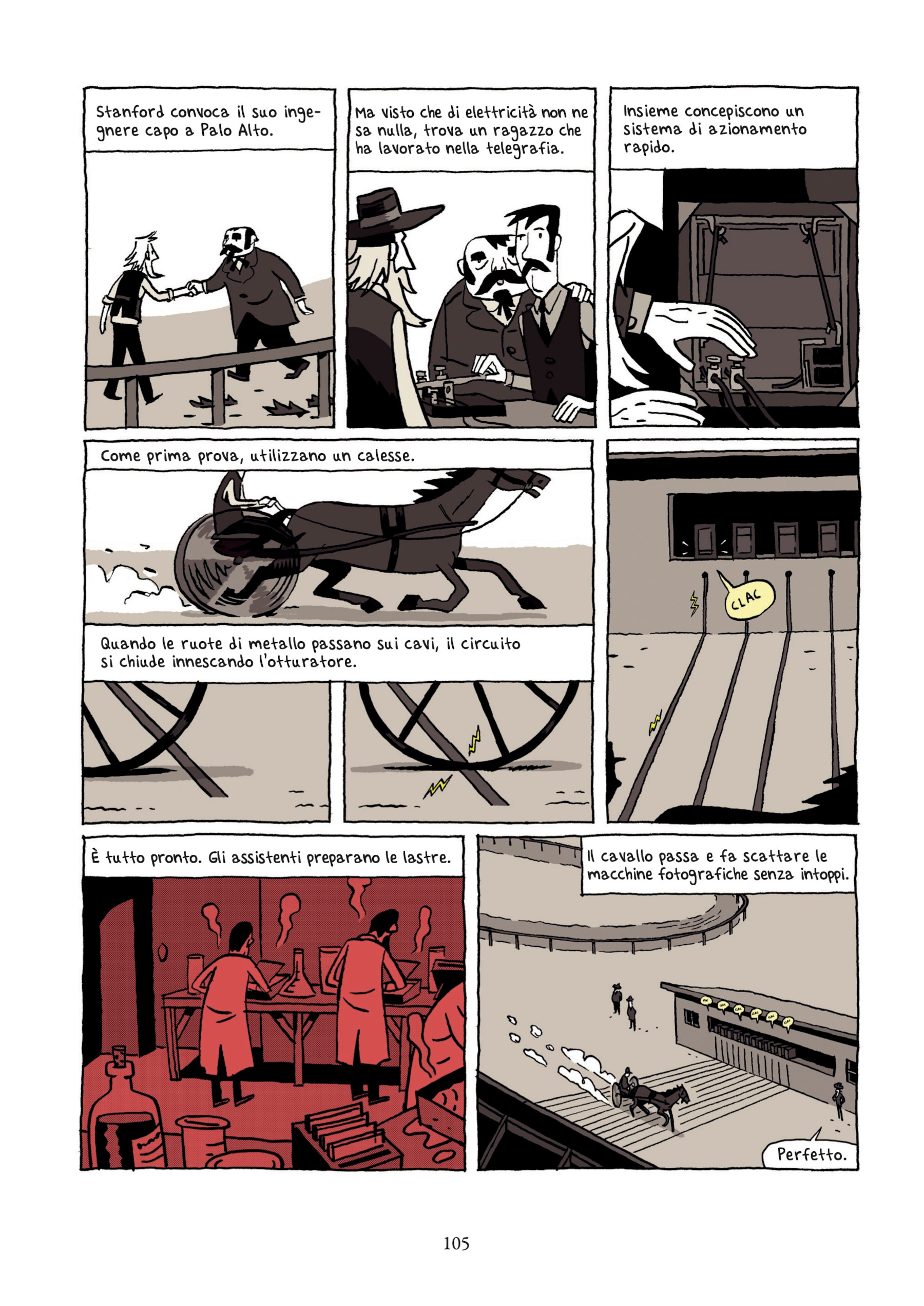 Sfogliando le oltre duecento pagine del fumetto, gli eventi vengono passati in rassegna con grande velocità, riuscendo a mantenere il lettore incollato alla storia, rapito dal ritmo e dalla eccezionalità degli episodi narrati. Come nel caso dell’incidente rimediato dal fotografo alla testa nel 1860, durante un viaggio in carrozza da New York a San Francisco: “Dopo 9 giorni di coma, Muybridge si risveglia in un letto di ospedale. I suoi capelli sono bianchi, ha perso l’odorato, l’udito e ci vede doppio. Anche il suo carattere è mutato. Ora è più impulsivo e aggressivo”. Stando alle fonti ufficiali, infatti, le lesioni celebrali causate da questo avvenimento modificarono per sempre la personalità del fotografo, aggiungendogli un elemento di bizzarria e irascibilità.