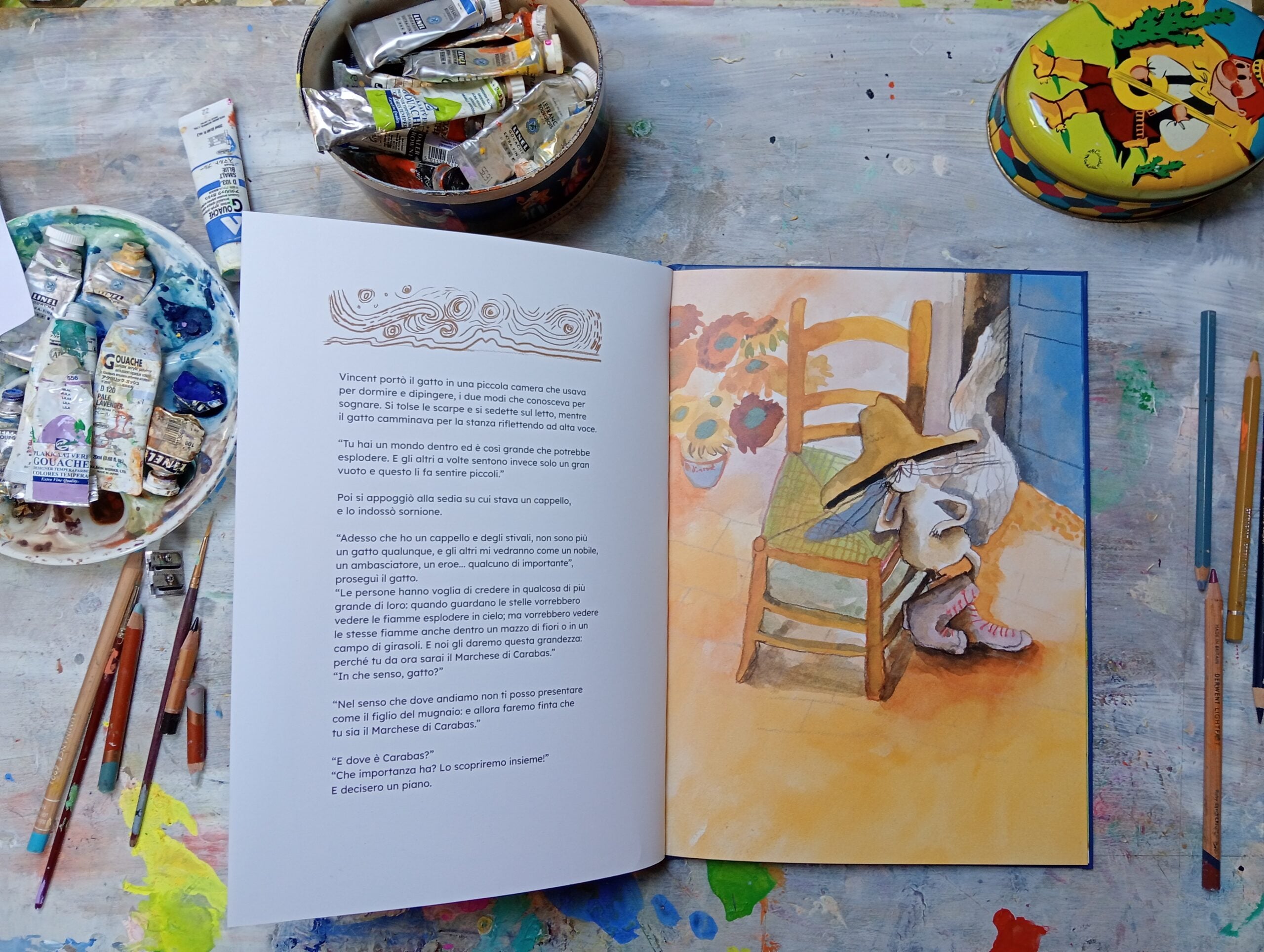 Il testo di Beniamino Sidoti contamina la fiaba con il racconto della vita di Vincent van Gogh, e viceversa, dando forma a una storia nuova dove emerge il lato più luminoso della sua personalità: ovvero le emozioni di un artista che scopre la sua arte. È grazie al dialogo con il gatto parlante, che suggerisce a Van Gogh di spacciarsi per il fantomatico Marchese di Carabas davanti al re, che l’artista decide di raccontare, attraverso la pittura, tutto quello che sente e che ha da dire.