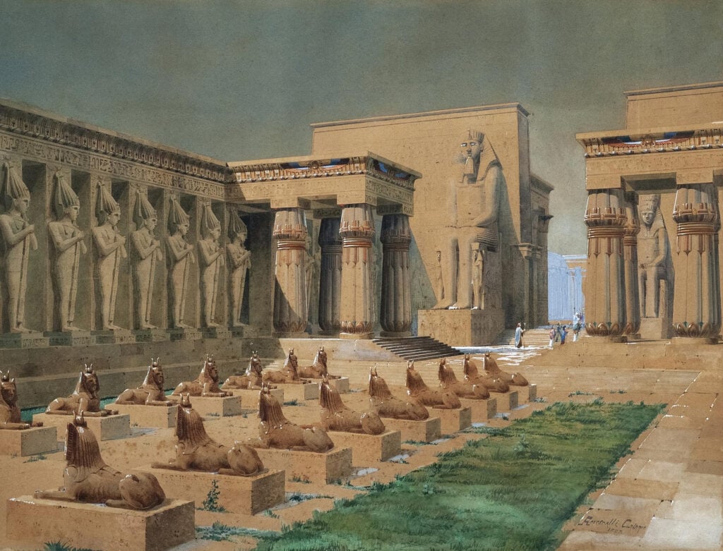 Di Antonio Rovescalli spicca nell’allestimento un ampio saggio di soggetto egizio che gli valse negli anni 1882-1883 la medaglia d’argento distinta all’esame finale della Scuola di prospettiva presso l’Accademia di Brera a Milano. Un acquerello ispirato all’Aida, ma realizzato rifacendosi a note architetture dell’antico Egitto: nella fattispecie il Ramesseo, il tempio memoriale dedicato al faraone Ramesse II, verosimilmente conosciuto mediante suggestive tavole ricostruttive contenute nella Description. Inoltre, del pittore scenografo si possono osservare alcuni interessanti scatti fotografici relativi a sue messinscene dell’Aida al São Carlos di Lisbona, dove fu chiamato a lavorare dal concittadino Manini verso la fine del XIX secolo. Altre fonti esposte documentano invece la sua prolifica attività alla Scala di Milano, teatro in cui operò quasi ininterrottamente fino alla morte, affermandosi come protagonista indiscusso nella creazione di scenografie.