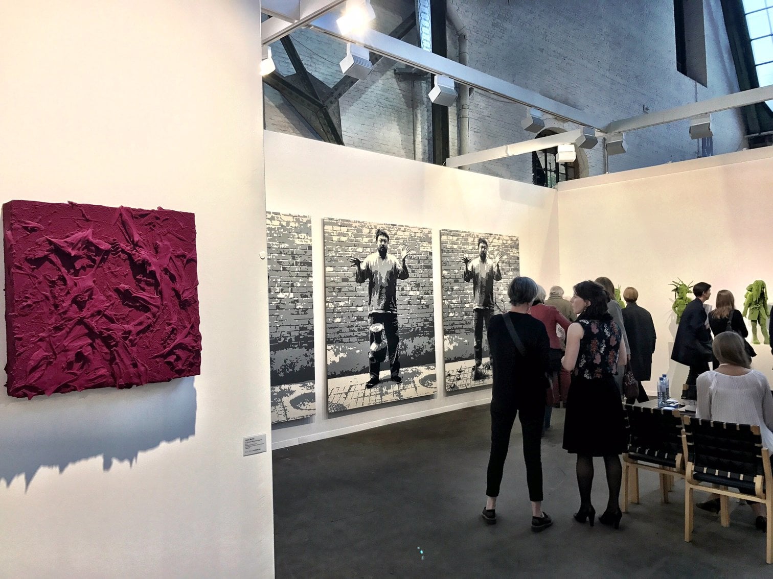 La potente galleria nordica si presenta con un bel Jason Martin bordò centrale, da una parte ci sono tre grossi Ai Weiwei fatti coi mattoncini del Lego in scale di grigi. A fianco le verdi sculture inquietanti di Kim Simonsson e dall’altro versante dello stand una rara grande Chantal Joffe (un piccolo lavoro della stessa artista sta anche nello stand della milanese Monica De Cardenas, oltre che sul nostro Instagram) e un bel lavoro classico di Jacob Hashimoto che così si prepara per le grosse cose che lo spettano in Laguna alla Biennale.