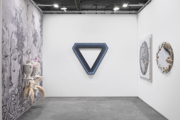 Giovani artisti con un’atmosfera da toilette rococò da Muciaccia Contemporary, la galleria romana che partecipa alla sezione Next creando un ambiente con opere di tre giovani artisti che comunicano con rimandi formali. A dominare la scena è What Holds it all Together, l’installazione di Diego Cibelli (Napoli, 1987) composta da una grande stampa in plexiglas che riempie la parete di uno stand e foggiatura in porcellana ispirata alla tradizione di Capodimonte, dando vita a un effetto ironico-straniante. Sull’ironia punta anche Giulio Alvigini (Tortona, 1995), con i suoi asciugamani che portano la scritta Galleria Portami Via o la bandiera Anti Artworld Artworld Club. Dal domestico all’infinito: l’installazione di Nicole Voltan (Mestre, 1984) 88 Trame – The Feminine, presenta 88 costellazioni disegnate con ago e filo in uno spazio geometrico triangolare che simula una matrice cosmica. Thirsty World, infine, è il grande disegno a grafite su carta che proietta la visione distopica di una sfera terrestre totalmente priva di acqua.