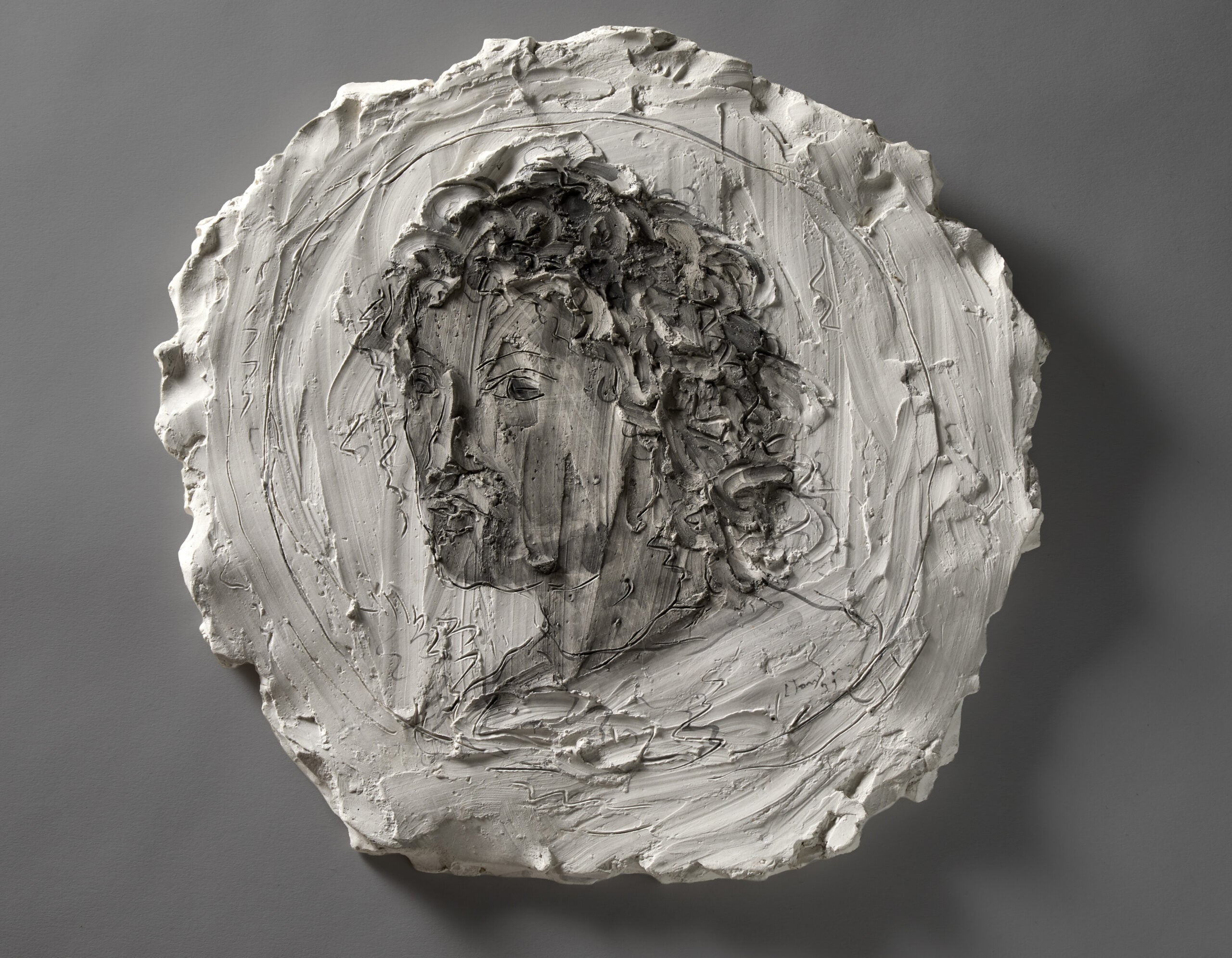 Lo stesso principio di decorazione d’autore conduce a un altro lotto in catalogo da Il Ponte a Milano, proveniente sempre da Casa G.: un lampadario a luce indiretta con motivi in gesso a girali, organici e simili a quelli che animano la console. Realizzato nel 1949-’51, il sistema sembra declinare nello spazio privato dell’appartamento milanese la riflessione che, nelle gallerie d’arte, trovava corpo – o meglio, luce – negli Ambienti Spaziali. Così come la suggestione del Barocco, presente in entrambi i lavori, e che per il Fontana del Manifiesto Blanco (1946) anticipava la ricerca contemporanea, “per lo stretto nesso tra arte e scienza che avrebbe spinto gli artisti a liberare la figura in senso spaziale” (Campiglio), era già principio vivificante nel suo Ritratto virile del 1939, che rappresenta forse Gianlorenzo Bernini, con un un graffito sul gesso ancora fresco e poi ripassato in nero. L’opera proviene dallo studio milanese di un pittore e collezionista, che Lucio Fontana frequentava e con il cui figlio, architetto, collaborò in più occasioni. A chiudere il cerchio su un incrocio fecondo, che arriva a noi, oggi, attraverso un’eredità di oggetti, opere e idee.