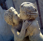“Dammi mille baci, poi cento poi altri mille, poi ancora cento”. Se riusciamo a collocare il primo componimento sul bacio al I secolo a. C. – grazie al carme di Catullo – non è invece data a sapere la sua più antica trasposizione iconografica. Deriva dalla trasformazione dell’atto materno di nutrire la prole dopo aver masticato il cibo, a detta degli antropologi, e viene quindi fatto risalire alla preistoria. Nonostante ciò, gli esempi più arcaici del bacio sono da ricercarsi in ambito attico tra la ceramica greca a figure rosse – dove scene d’amore platonico, saffico ed efebico sono assai diffuse – e successivamente in alcuni degli affreschi pompeiani, come quello dedicato a Polifemo e Galatea. Seguito tre secoli dopo dal gruppo scultoreo di Amore e Psiche, rinvenuto a Ostia antica nell’omonima domus.