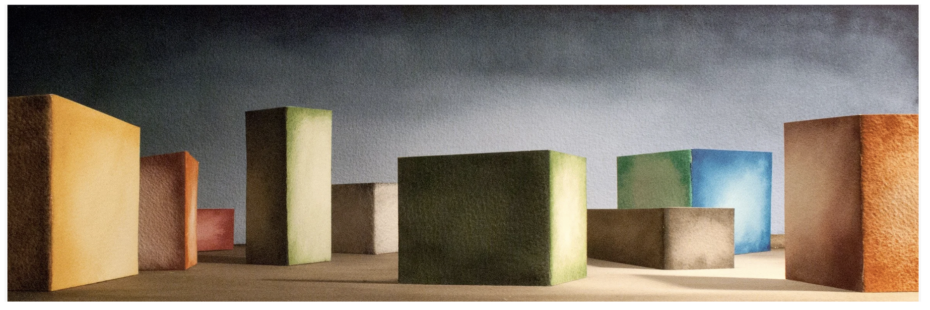 Mi rendo però conto, osservandomi dall’esterno, che tutti i miei progetti artistici hanno una matrice architettonica: lavoro a partire da principi che ho imparato facendo architettura, sia nell’idea di serialità che caratterizza i miei cicli pittorici – affrontati come una serie di variazioni sul tema dato, partendo da una progettualità razionale – sia nell’affrontare gli allestimenti tenendo conto di elementi essenziali come lo spazio, il colore, le relazioni.