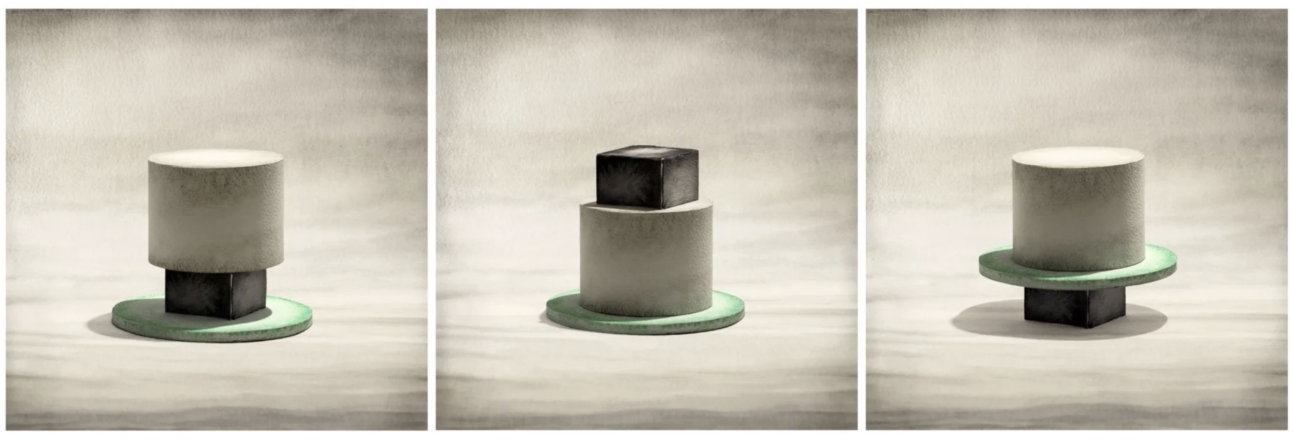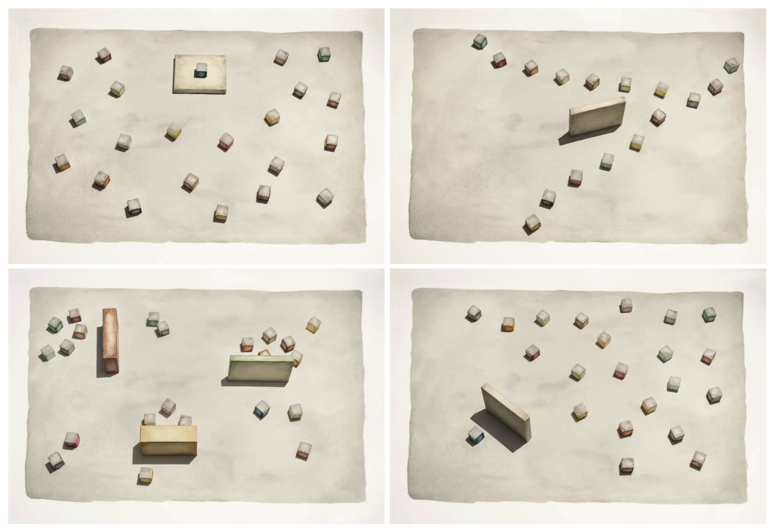 Per il lavoro sulle Mappe costruisco oggetti tridimensionali ispirati alle forme geometriche che dipingo con gli acquerelli; poi li metto in scena e li fotografo. Gioco, innanzitutto, con l’ambiguità di una fotografia che sembra un dipinto. E poi sulla lettura delle coordinate spaziali: questi elementi diventano costellazioni, suggeriscono pattern e relazioni, proprio come le dinamiche che si creano tra persone. Come ci si muove all’interno dello spazio, avvicinarsi o allontanarsi, determina relazioni: ecco come l’architettura entra nell’arte. Mentre l’arte mi aiuta a mettere in scena il concetto di rappresentazione, contraddetto dalla verità della fotografia. Cerco di lavorare su questa dicotomia percettiva: c’è una vita fisica, ma anche qualcosa oltre, che spazio e colore possono aiutarci a comprendere.