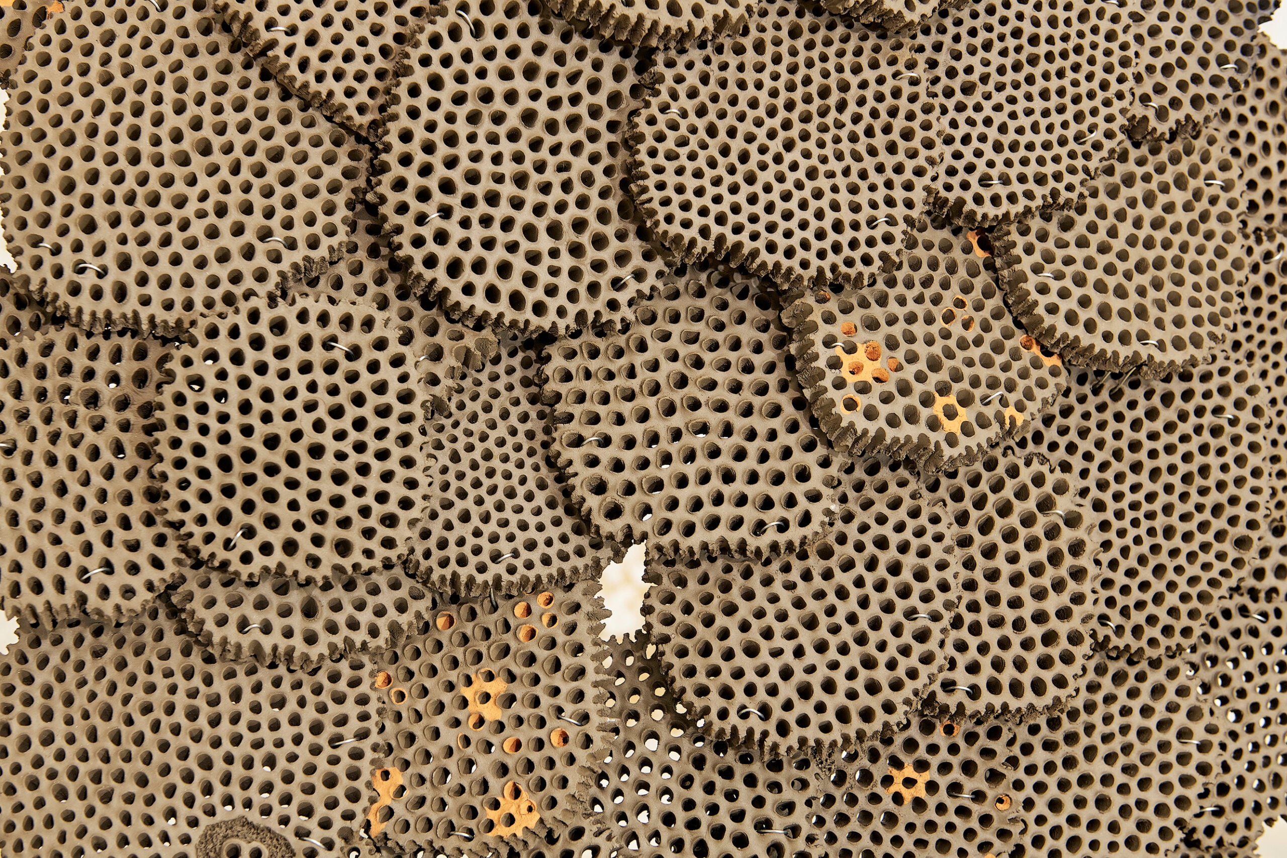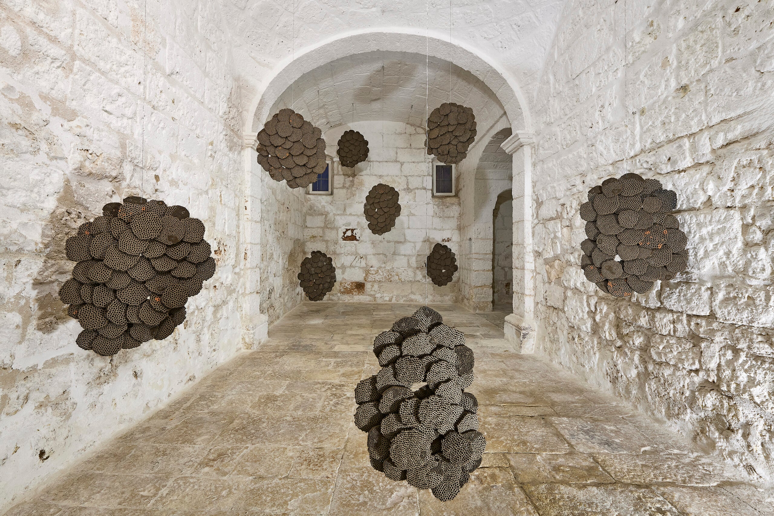 È del collettivo Like a Little Disaster. “La scultura non rappresenta un alveare, ma ne assume la logica ontologica: esistere come collettivo, intelligenza distribuita, mente plurale. Non un centro che governa, ma una cognizione diffusa che emerge dall’interazione continua tra frammenti. […] L’opera si configura allora come un campo di risonanza, in cui il gesto individuale si intreccia con un gesto collettivo che nessuno controlla interamente” (dalla didascalia dell’opera “Mente Alveolare”, Like a Little Disaster, ndr.).