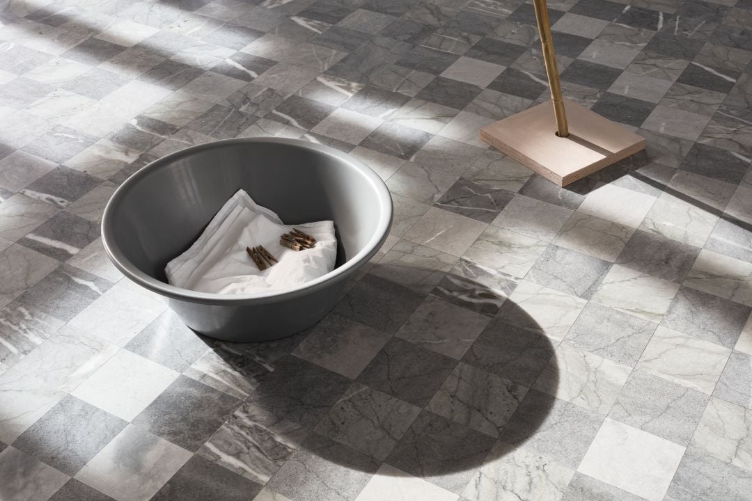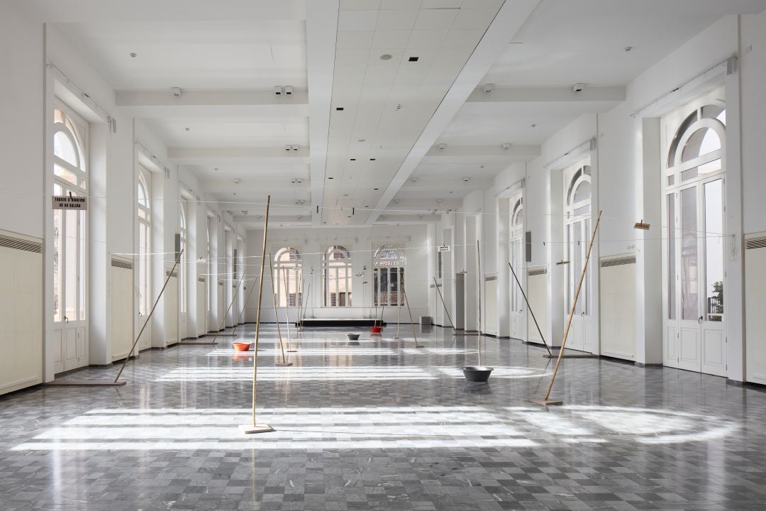 Secondo una pratica consueta per l’artista, l’opera viene attivata 4 volte al giorno da un gruppo di performer che, con gesti molto lenti, aggraziati, coreografici, stendono e ritirano le lenzuola. Un atto che oltre a voler sottolineare che questa non è la realtà ma una sua rappresentazione, offre la possibilità ai visitatori di osservarla nella sua duplice modalità. Completamente spoglia, in cui la scarna struttura si profila quasi come un esile disegno nell’aria e poi arricchita dalle lenzuola che, durante il giorno, proprio come una meridiana, creano suggestivi giochi di luce, instaurando un parallelismo con Lantern with clock mechanism (2025) nella prima sala.