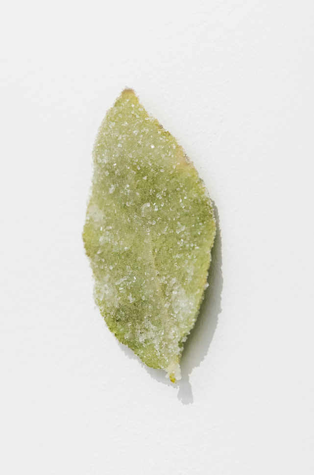 Nella tua bella mostra c’è una superficie di sfalcio fresco che man mano invecchia dove sono installate le galvanoplastiche, ci sono foglie caramellate nello zucchero, terre di riporto dove stanno germogliando piantine selvatiche: ci sono trasformazione, conservazione, rinascita. Cosa potresti dirmi di queste tre sfaccettature di processi di crescita, maturazione, deperimento?
