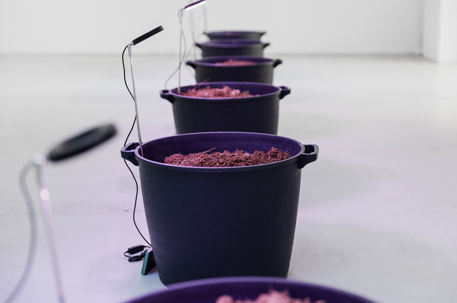 Come nella selezione della produzione filmica di Baruchello con cui sono entrata in dialogo per la mostra, non ho che seguito i cicli di naturali, guardato alla terra non come sola metafora, ma come fece Baruchello coltivandola, anche nei suoi aspetti profondi, ascoltandone i tempi e cercando di entrare in sincrono. Il linguaggio dell’arte è fatto anche dei materiali con cui decidiamo di interagire, così in mostra ogni elemento è in sé per sé: sia lo zucchero delle barbabietole – già coltivate da Baruchello – che cristallizza foglie di olmo o un prato che sfalciato decade e che tornerà humus di quel campo da dove viene, come la terra delle ceste che stanno germogliando. Finito il tempo breve e umano della mostra, inizia il tempo quasi incommensurabile della trasformazione geologica, l’impercettibile tempo vegetale che ci circonda. Disperde l’idea del messaggio certo a favore di un divenire. Tra altri trent’anni le guarderemo rigogliosamente fiorite dopo aver lasciato voce libera al dialogo inter-specie.