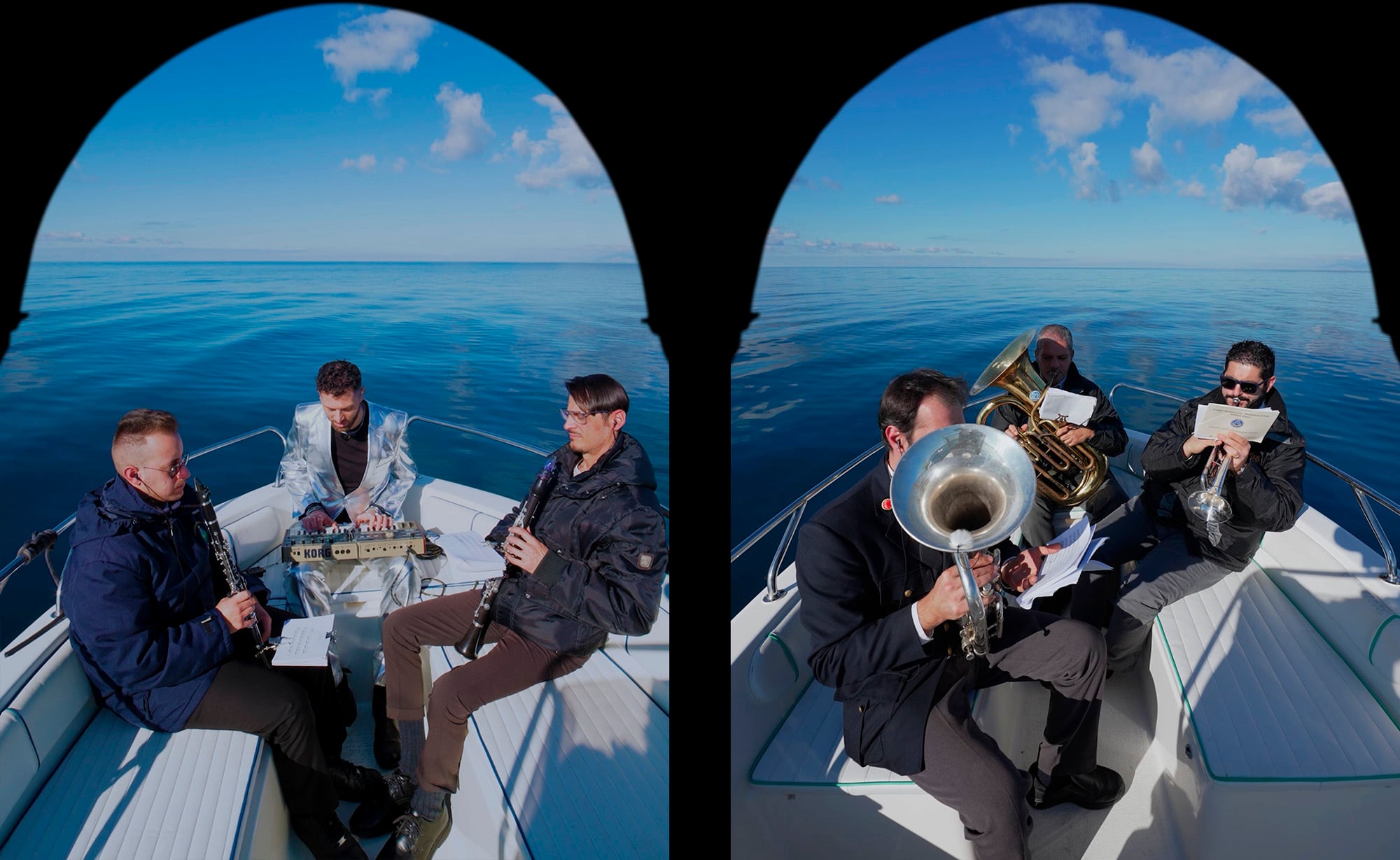 Abbiamo cercato di farlo attraverso un gesto “condiviso”. Il 10 dicembre 2025 la Banda di Pizzo Calabro, diretta da Alessandro Maglia, ha eseguito in mare aperto due requiem e due brani contemporanei, tra cui Pianto Eterno e Cristus, insieme a composizioni scritte per il progetto come Rotta e L’arte non serve a niente. Alla performance ha partecipato anche Marco Guazzone. A chiudere l’installazione c’è poi il brano del compositore Rakans, che oggi vive in Germania ma è arrivato in Europa attraversando proprio il Mediterraneo. La musica dà forma all’azione e la trasforma quasi in un rito laico, riportando attenzione su storie che spesso restano ai margini della cronaca.