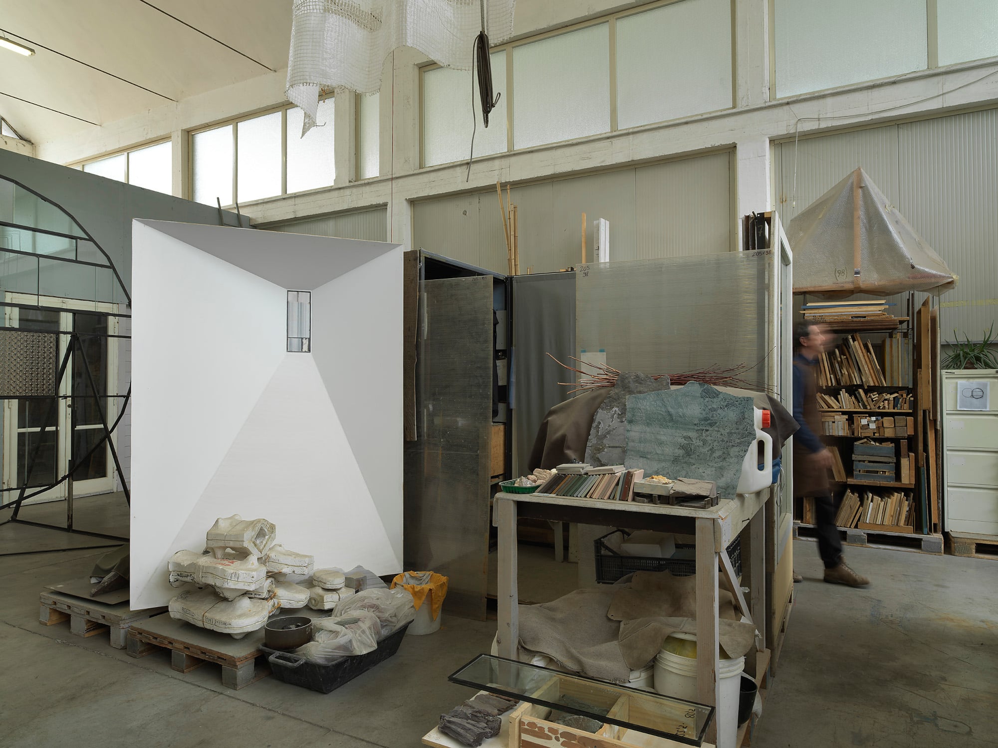 Il mio studio si trova a valle, in una contenuta zona artigianale che spesso funge da deposito di grandi blocchi di marmo. La mia casa invece si trova in un paese sui monti; la strada per arrivarci attraversa i boschi e questo piccolo spostamento insieme al suo silenzio, creano una pausa, uno stacco che mi sembra mi faccia bene.