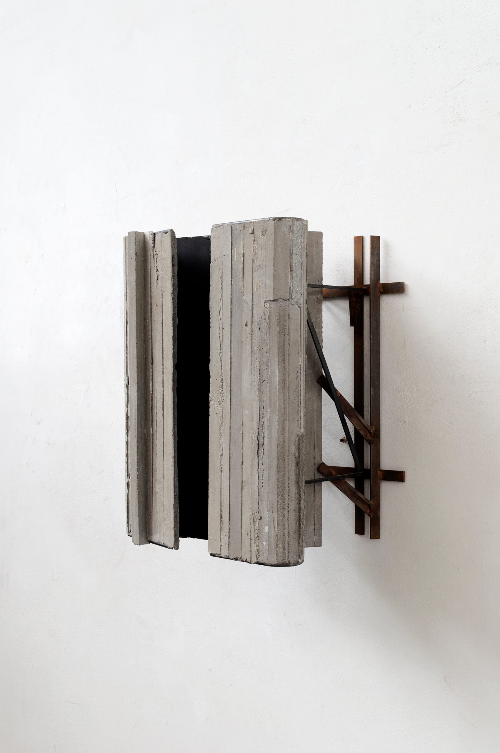 Alcune sculture che ho realizzato si chiamano Luogo. Sono opere costruite direttamente a parete utilizzando materiali legati alla scultura e all’architettura; frequentemente impiego acciaio, cemento, gesso, pietre. Quando qualcuno che non si interessa molto d’arte mi chiede che tipo di sculture realizzo, rispondo che sono opere che possono ricordare l’architettura.