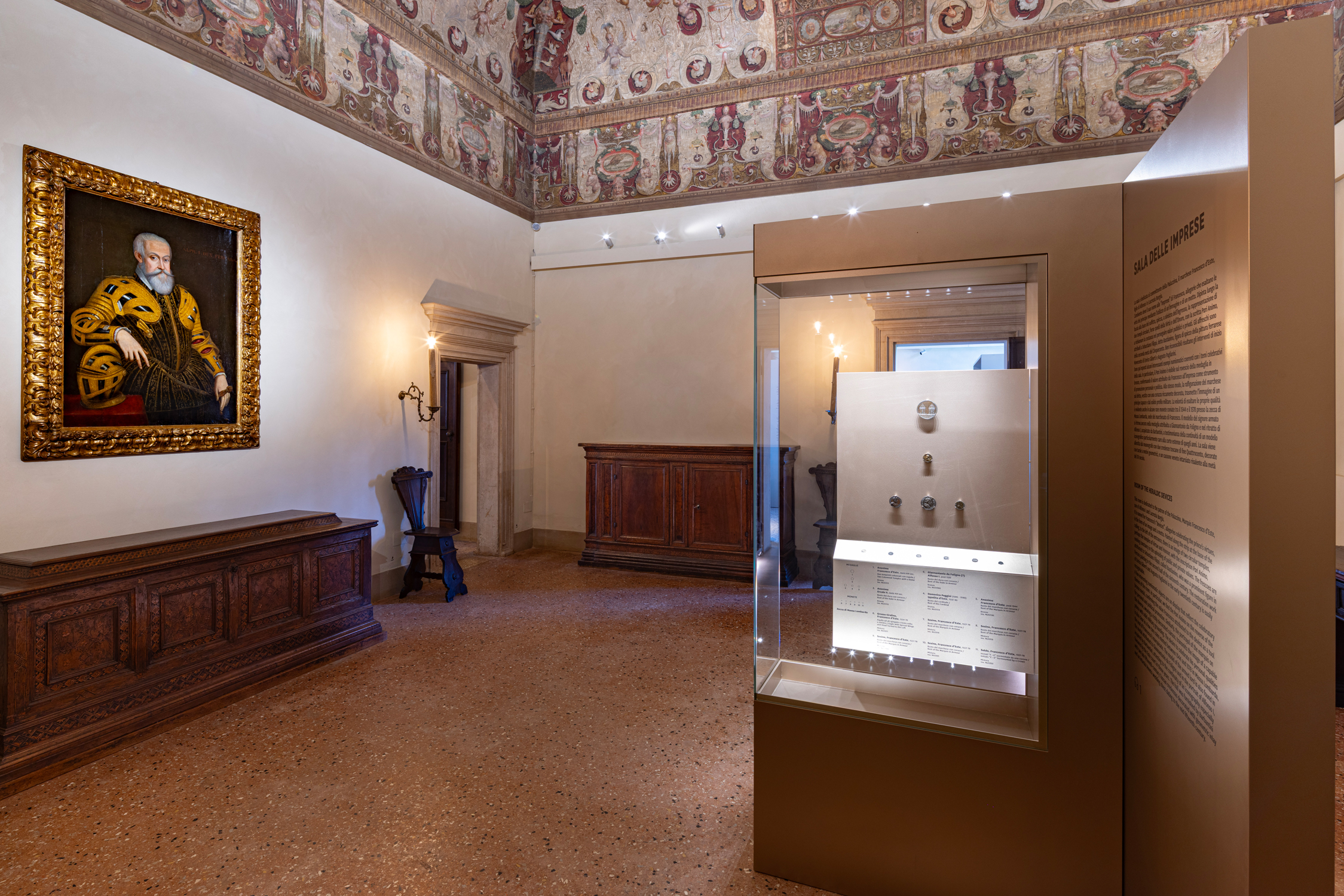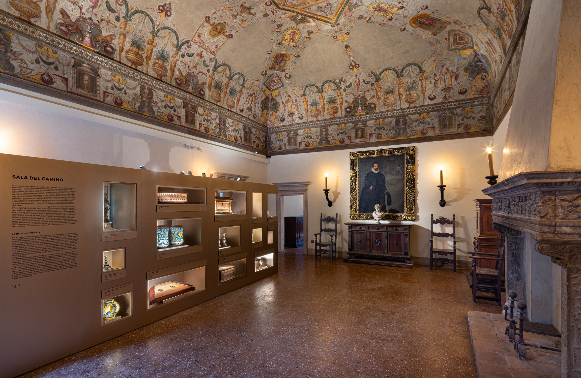 Un altro filo conduttore è il recupero dell’allestimento ideato nel 1938 da Nino Barbantini, storico museografo ferrarese, che trasformò la Palazzina in una dimora di rappresentanza rinascimentale, acquistando sul mercato antiquario mobili e opere d’arte dal Quattro al Settecento. L’attuale riallestimento dialoga rispettosamente con quell’impianto, mantenendone gli equilibri ma aggiungendo una nuova identità visiva e un filo narrativo chiaro e coerente.
