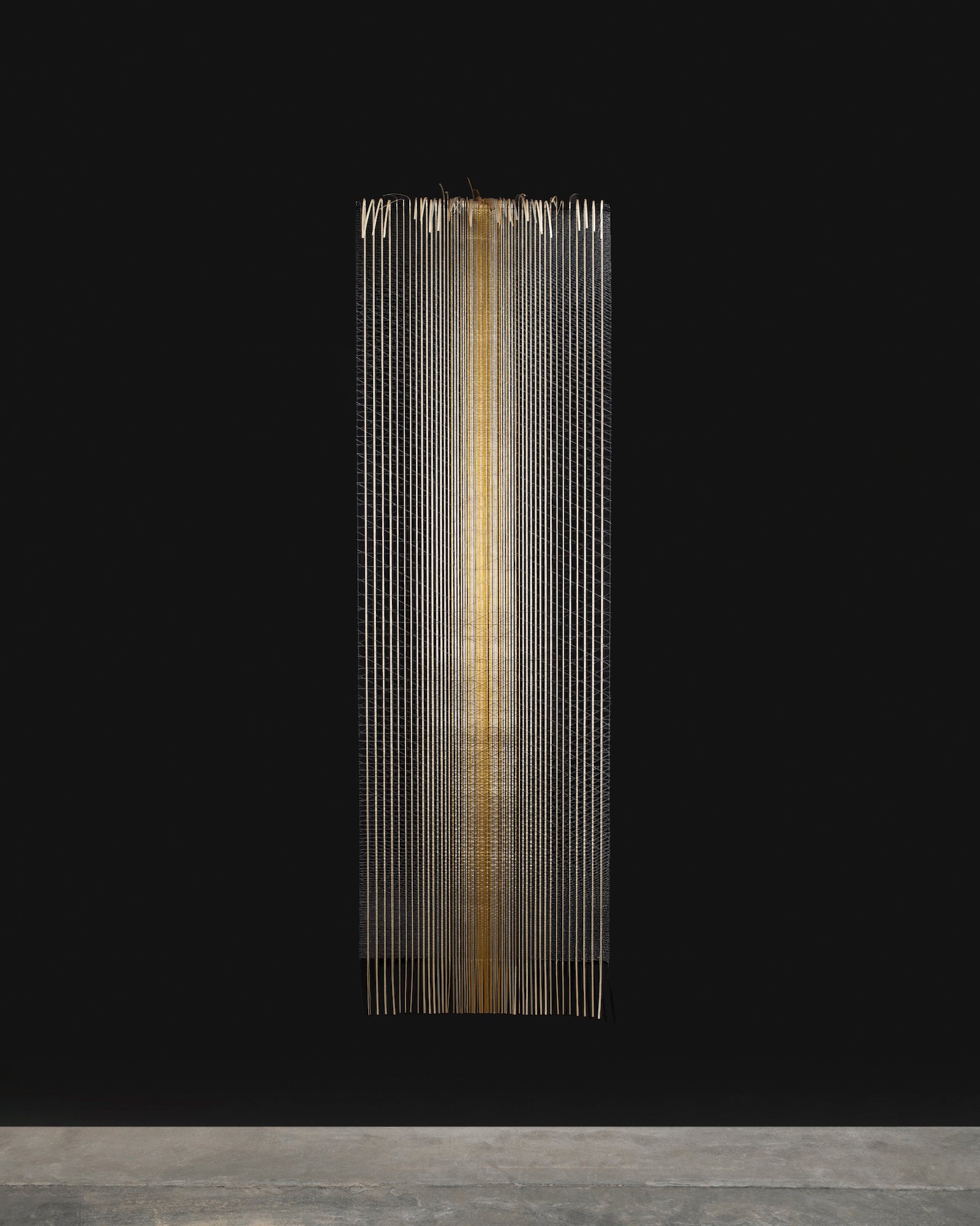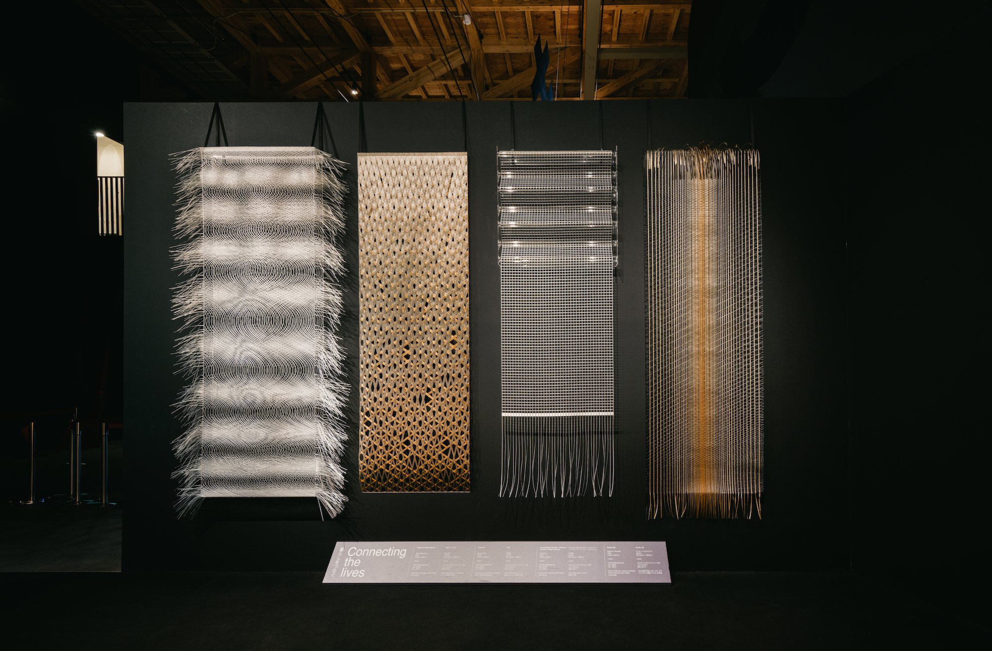 Ad arricchire questa collezione già ampia e sfaccettata, i nuovi arazzi presentati a Osaka. Shades. BG di Migliore + Servetto è un’opera ambientale pensata per porsi in dialogo con lo spazio che l’accoglie,ispirata al concetto di attraversabilità e al rapporto che instaura con lo scenario circostante attraverso il linguaggio grafico delle texture. Filamenti neri s’intrecciano con filamenti dorati in un disegno verticale perfettamente ortogonale che si fa più denso al centro, sfumando poi verso i margini. Il design dell’arazzo Fuku-Ori di Kengo Kuma prende invece ispirazione dal Kumiko, l’arte tradizionale giapponese utilizzata per realizzare paraventi shoji, porte scorrevoli e altri elementi decorativi in legno. I due motivi geometrici sovrapposti che lo compongono – creati senza chiodi, utilizzando la tecnica del Kumiko-haiku – rappresentano strati di benedizioni: dall’alto verso il basso, la struttura si trasforma gradualmente da densa e solida a trama più aperta e ariosa, evocando il lento disfacimento delle fibre.