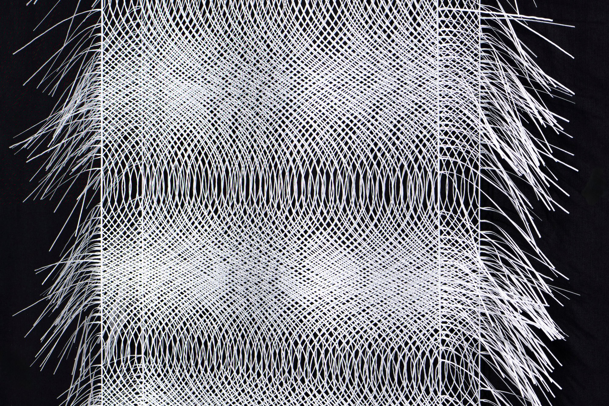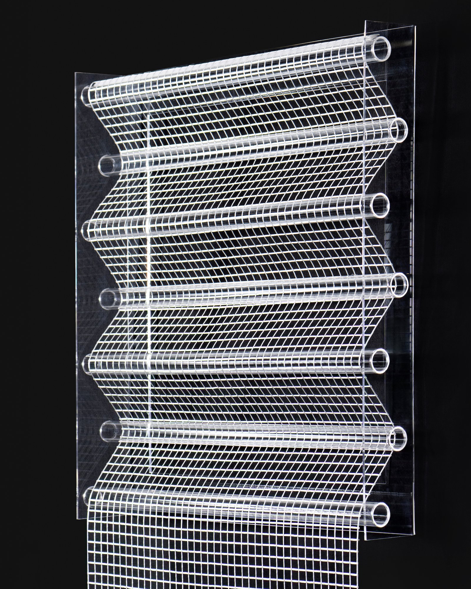 Cascata/Griglia Morbida è stato disegnato da Tomo Ara come omaggio a Cristiano Toraldo di Francia, scomparso nel luglio 2019, con cui l’architetto e designer nipponico lavorò a stretto contatto. L’opera riflette l’influenza globale dell’avanguardia di Superstudio, reinterpretando le geometrie degli Istogrammi di Architettura attraverso una griglia tridimensionale fluida e dinamica; la composizione si sviluppa come una superficie bianca, continua e coesa, in cui le parti arrotondate permettono alla griglia di spostarsi da un piano all’altro, evocando un diagramma fisico e mentale in continua evoluzione. Mentre in Wave as a phenomenon la connazionale Yuko Nagayama sovrappone pattern di varie dimensioni per raccontare le onde come un fenomeno che emerge dai sottili vuoti tra di esse e si muove in risposta ai movimenti dei visitatori.