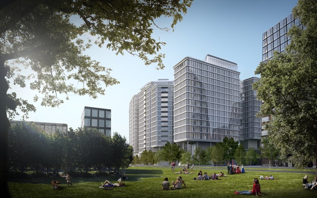 Saranno cinque gli edifici firmati Renzo Piano, in collaborazione con lo studio viennese NMPB Architekten, per Signa Development. Sulla carta paiono avere interessanti prospettive estetiche e ambientali, tali da confermare le doti compositive del progettista italiano. Cinque corpi formalmente coesi, slanciati, ritmati tra pieni e vuoti da una griglia di superficie, ciascuno di essi con differente pianta poligonale, e poggianti su pilotis particolarmente alti. Quest’ultima soluzione, chiaramente ispirata a paradigmi lecorbusiani, andrà a formare un vuoto costruttivo tra il terreno e i volumi abitativi a vantaggio di un impianto vegetativo a basso e ad alto fusto, senza interferire con gli affacci dei piani bassi. Soprattutto, così disposta, l’area residenziale verrà a saldarsi con lo Schweizergarten, il bel parco che gli è confinante sul versante est.