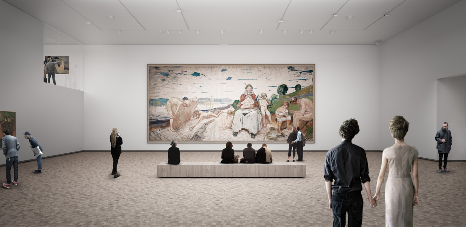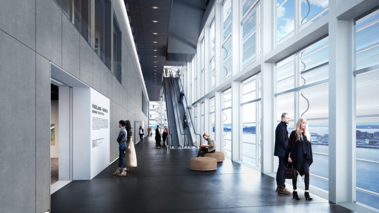Il progetto, con i suoi 24,500 mq tra museo e spazi pubblici, offre diversi luoghi dove sperimentare l’arte: la stessa lobby sarà “un’estensione dello spazio pubblico a Bjørvika, invitando tutti a entrare e trasformare il museo in una struttura di vita quotidiana.” Ci sono quindi due livelli su cui agisce il Lambda: quello espositivo per il Munch Museum, e quello urbano. È composto da un nucleo di cemento “statico” e da uno spazio di circolazione “dinamico”. Juan Herreros e Jens Richter ci descrivono le sale espositive del nuovo Munch Museum che saranno “dimensionate in maniera specifica per questa collezione unica con tutta la sua diversità di opere e formati: vi sono infatti sale più raccolte adatte a ospitare le stampe di Munch su carta, e stanze per le opere monumentali come i dipinti ‘Alma Mater’ o ‘The Sun’. Una tecnologia all’avanguardia studiata dal punto di vista olistico, completamente incorporata nei pavimenti, soffitti e pareti, soddisfa le più alte esigenze museali, e allo stesso tempo crea spazi espositivi ultramoderni che rendono protagonisti sia le opere che i visitatori”.